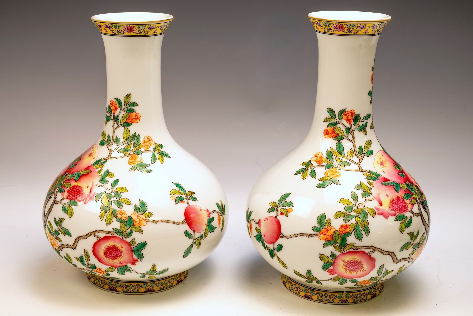 Imperial Yongzheng Period Vases of the Qing Dynasty: Pear-Shaped Design with Pomegranate Tree Motif, Executed in Falangcai Enamels and Highlighted by a Four-Character Yuzhi Mark Enclosed in Double Squares
