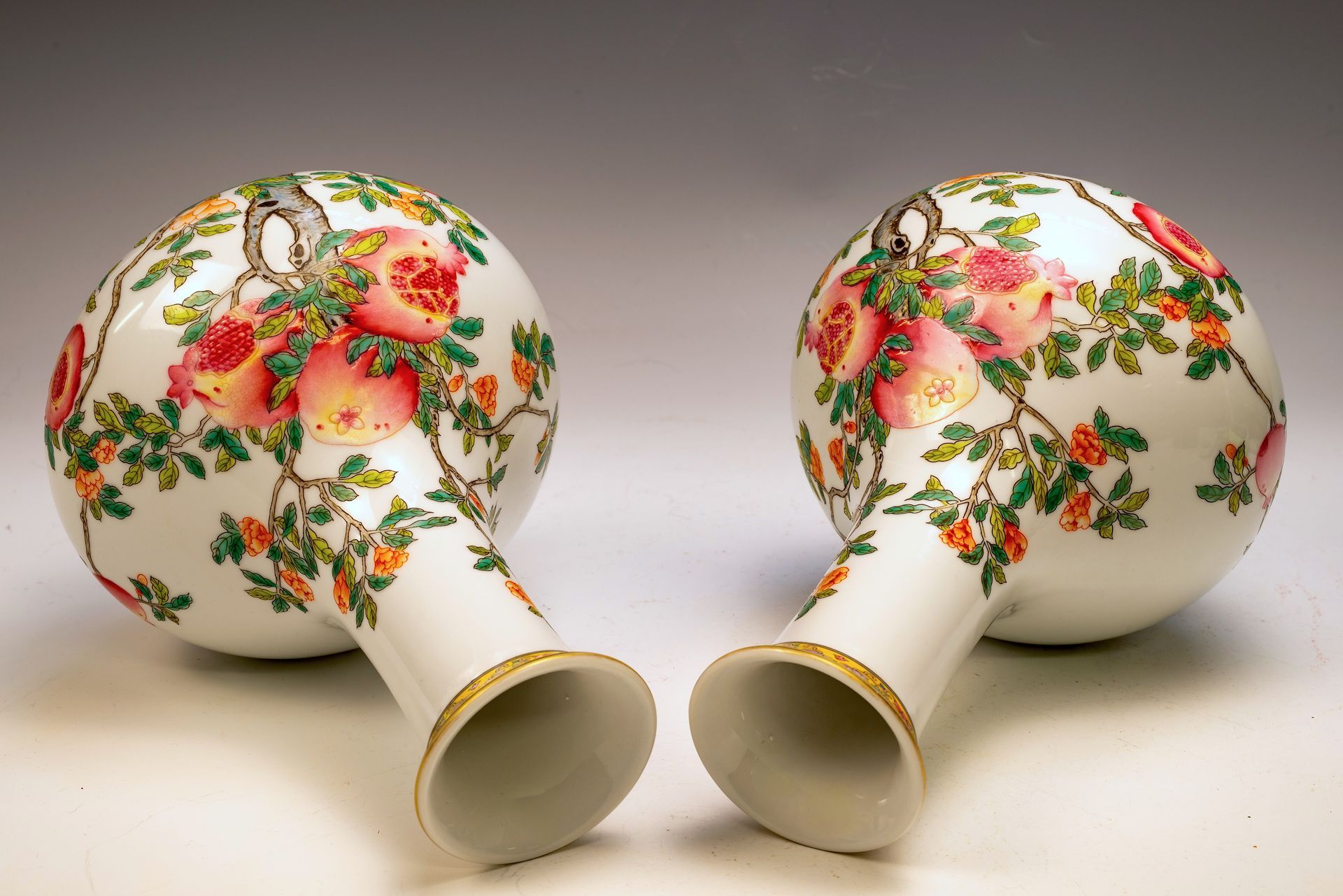 This distinguished pair of Yongzheng Promegranate Pear form Vases, from the Qing Dynasty, and both marked and authentic to the period. Crafted with exquisite form, these pear-shaped vases utilize the falangcai palette of colored enamels, which is notable for its vibrant hues and intricate details. Each vase is decorated with a Pomegranate Tree with branches, blooms, leaves, and fruits. These Pear form Vases exemplify the artistry characteristic of falangcai enamels. The base of each vase is adorned with the four-character Yongzheng Yuzhi mark, rendered in blue enamel within a double square—a hallmark of quality and authenticity. Attention should be drawn to the meticulous details, color balance, and shading that define these pieces. It is important to note the presence of some flaking in the biscuit, an indication of their age, while crazing is evident in the enamels, which often characterizes falangcai wares. The color palette itself remains remarkably beautiful. Each Yongzheng vase measures approximately 8 1/2 inches in height. ppjrs