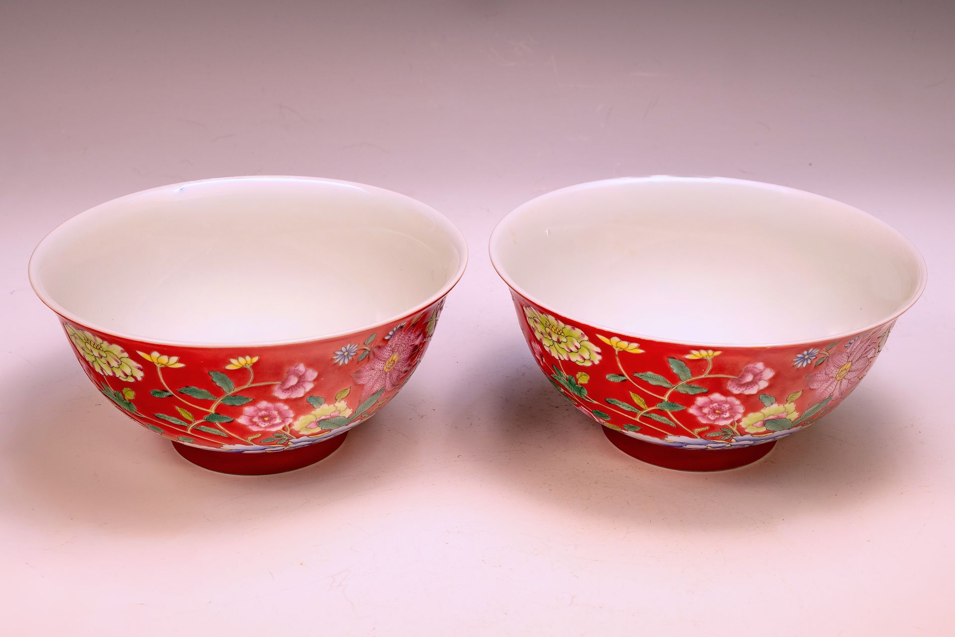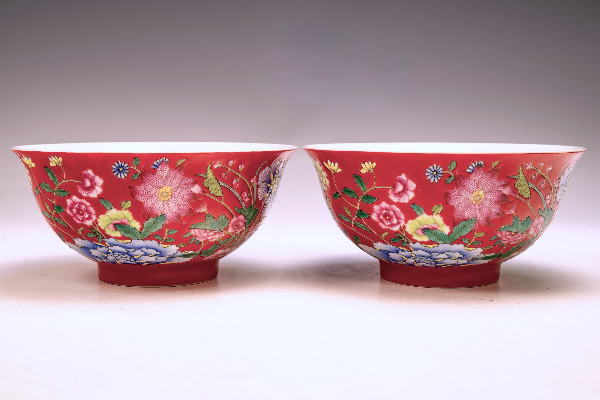 Pair of Imperial Qing Dynasty Kangxi-Era Bowls Embellished with Floral Motifs, Showcasing Falangcai Enamels and the Deep Red Yuzhi Mark with Double Square Inscription from the Period