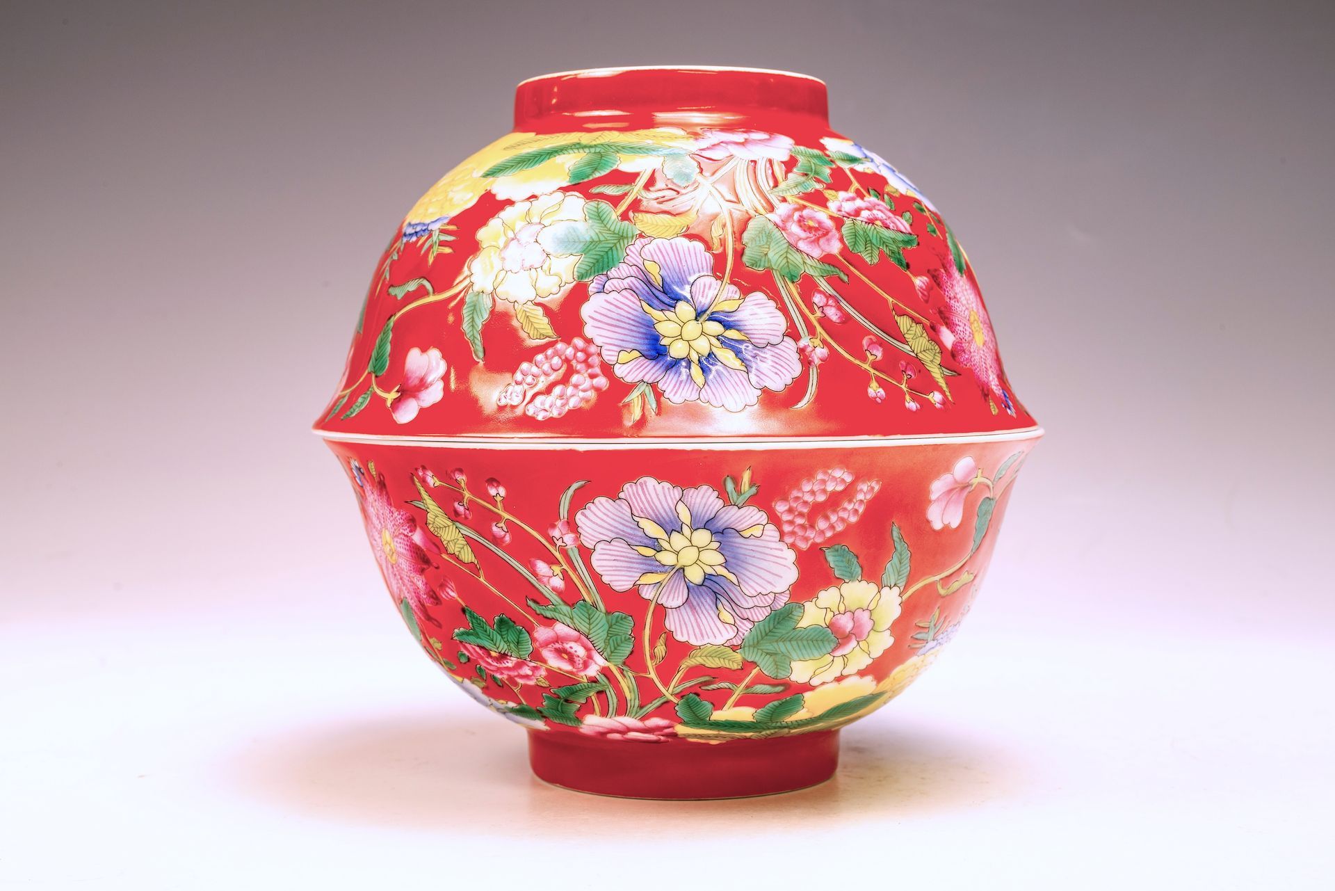 Qing Dynasty Imperial Qianlong Mark and Period Red Ground Ovoid Vase Decorated with Birds Motif
