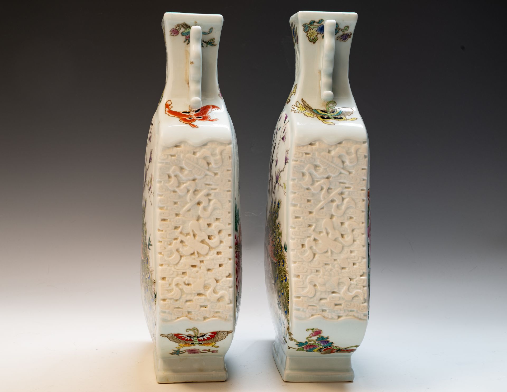 Mark and Period Qianlong: Pair of Famille Rose Vases in Violin Form Featuring Blown-On Decorations from the Qing Dynasty