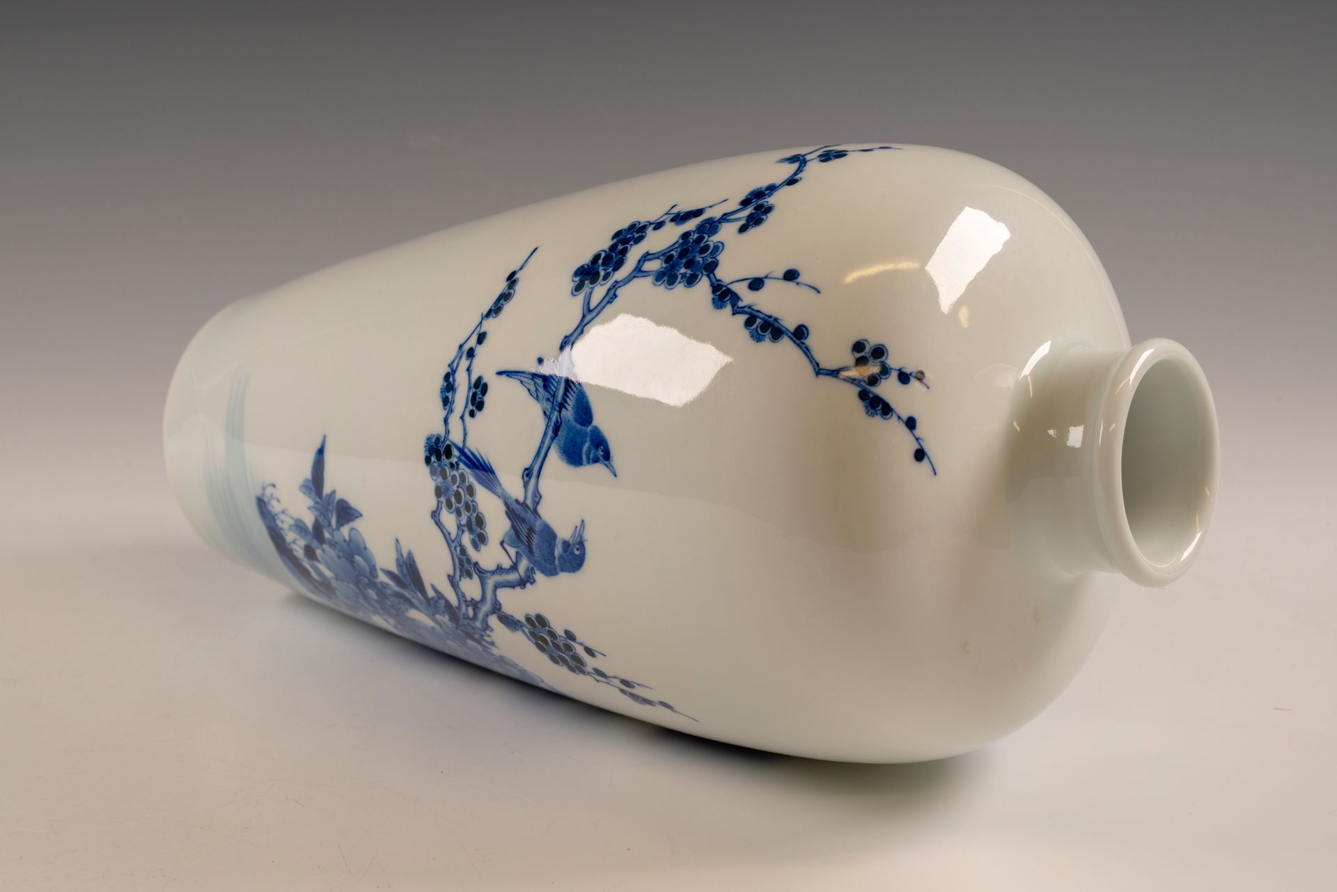 This Qing Dynasty Kangxi vase, distinguished by its marked authenticity, exhibits a refined form representative of the period. This blue and white vase is elegantly adorned with motifs of rocks, peonies, and two magpies perched upon a branch, complemented by an inscription of poetry on the reverse side. Careful attention to detail, tonal balance, and shading is essential for understanding the characteristics that define a superior example of Kangxi blue and white porcelain. The vase features the Kangxi underglaze six-character mark enclosed within a double circle at its base. This exemplary piece has been expertly crafted and measures approximately 12 5/8 inches in height. ppjrs