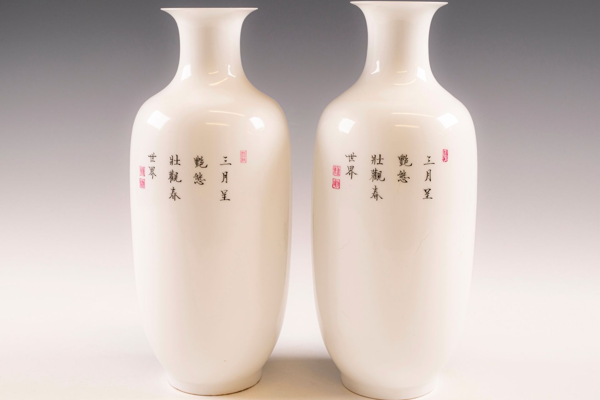 These remarkable Falangcai enamel vases exhibit an extraordinary thinness, measuring less than half the thickness of a dime at the rim. Crafted during the Yongzheng period (1723 to 1735) in the Forbidden City of Beijing, these vases showcase a remarkable artistry that is believed to have been directly overseen by the Emperor himself. The decoration features intricate motifs, including branches, flowering prunus, and birds, all rendered with the exceptional skill required for such delicate work. The distinctive palette characteristic of Yongzheng Falangcai enamels confers a unique identity to these pieces, facilitating their recognition among connoisseurs. On the reverse side, an inscribed poem accompanies three seals, further enriching the historical significance of the vases. The presence of the Yongzheng four-character mark, rendered in blue enamel within double squares on the base, attests to the authenticity of these artifacts, added by the decorators in Beijing. Notably, this pair of vases is not identical, which is consistent with typical Yongzheng creations. The artistry exhibited in these vases is exceptional, with their rim being so finely crafted that some may liken it to milk glass. The level of skill and precision involved in their production is indeed remarkable. The quality of these vases is outstanding; interested parties are encouraged to consult auction catalogs, scholarly publications, and museum collections to ascertain the rarity and excellence of such finely potted Yongzheng Falangcai vases. Each vase measures approximately 9 1/8 inches in height. ppjrs
