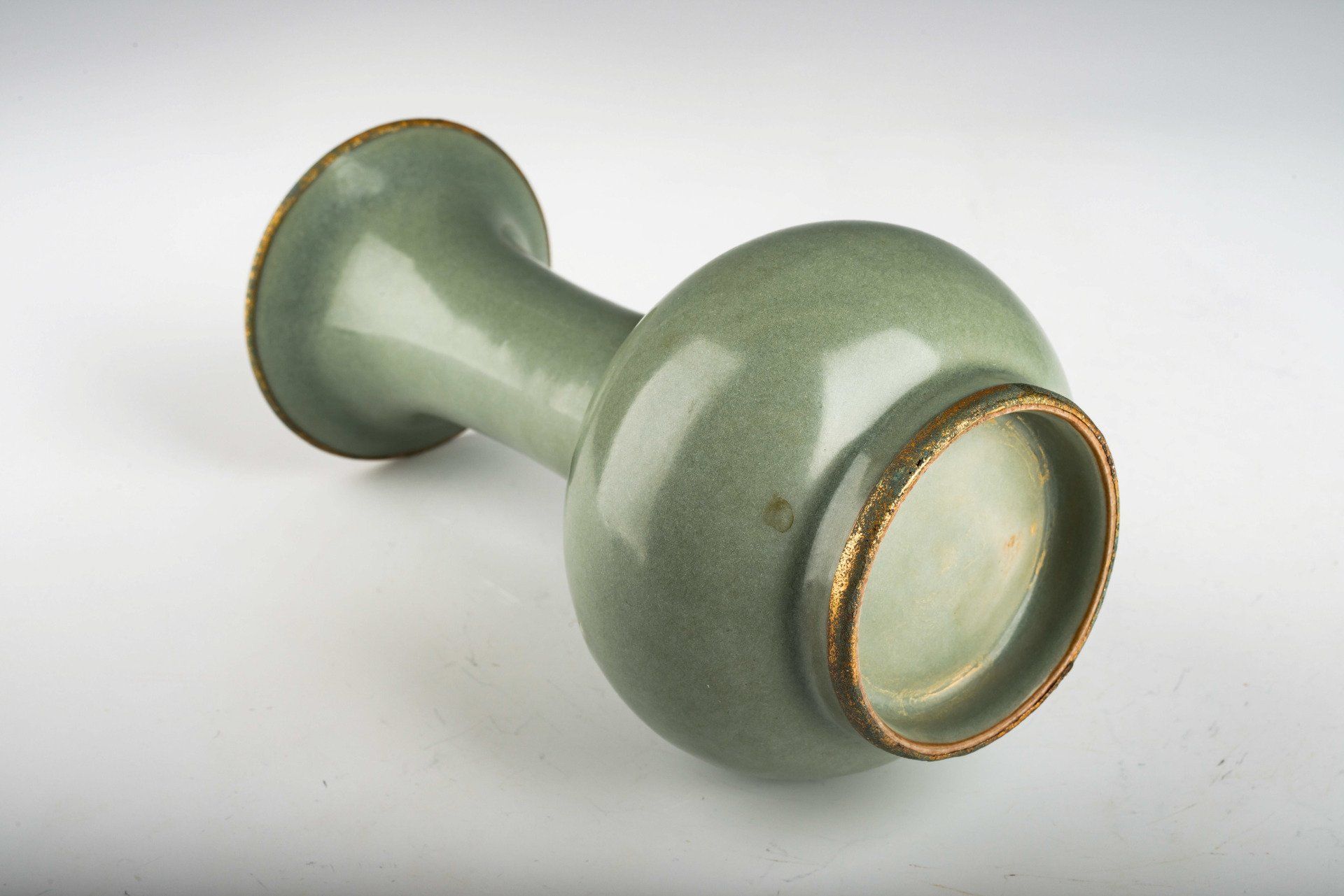 Эта исключительная вторая официальная императорская ваза Ru-kiln, выполненная методом конге, представляет собой одно из самых изысканных и роскошных селадоновых изделий, когда-либо созданных в Китае. Эти эксклюзивные работы были изготовлены специально для императора Хуэйцзуна и его достопочтенного двора. Ваза покрыта изысканной селадоновой глазурью, отличающейся богатой и гладкой текстурой, лишенной каких-либо трещин. Уникальной особенностью этой особой глазури является включение дробленого агата, видимого под 20-кратным увеличением и идентифицируемого по микроскопическим изображениям, сопровождающим каждое изделие. Дробленый агат является отличительным элементом, используемым исключительно в официальных императорских изделиях Ru, созданных под покровительством императора Хуэйцзуна. Кроме того, эта ваза конге украшена позолоченными медными полосами по краю и основанию, которые теперь демонстрируют коррозию, состоящую из куприта и малахита, что подтверждает ее значительный возраст. Это доказательство считается более надёжным, чем термолюминесцентный анализ, и принимается экспертами как окончательное средство подтверждения подлинности артефактов, поскольку оно не может быть подделано. Корпус вазы изначально имел грязно-белый оттенок, но после обжига приобрел коричневатый оттенок. Высота вазы составляет внушительные 7 дюймов (18 см), и она входит в сохранившуюся коллекцию изделий из жу-керамики эпохи Северной Сун, связанных с императором Хуэйцзуном. ppjrs