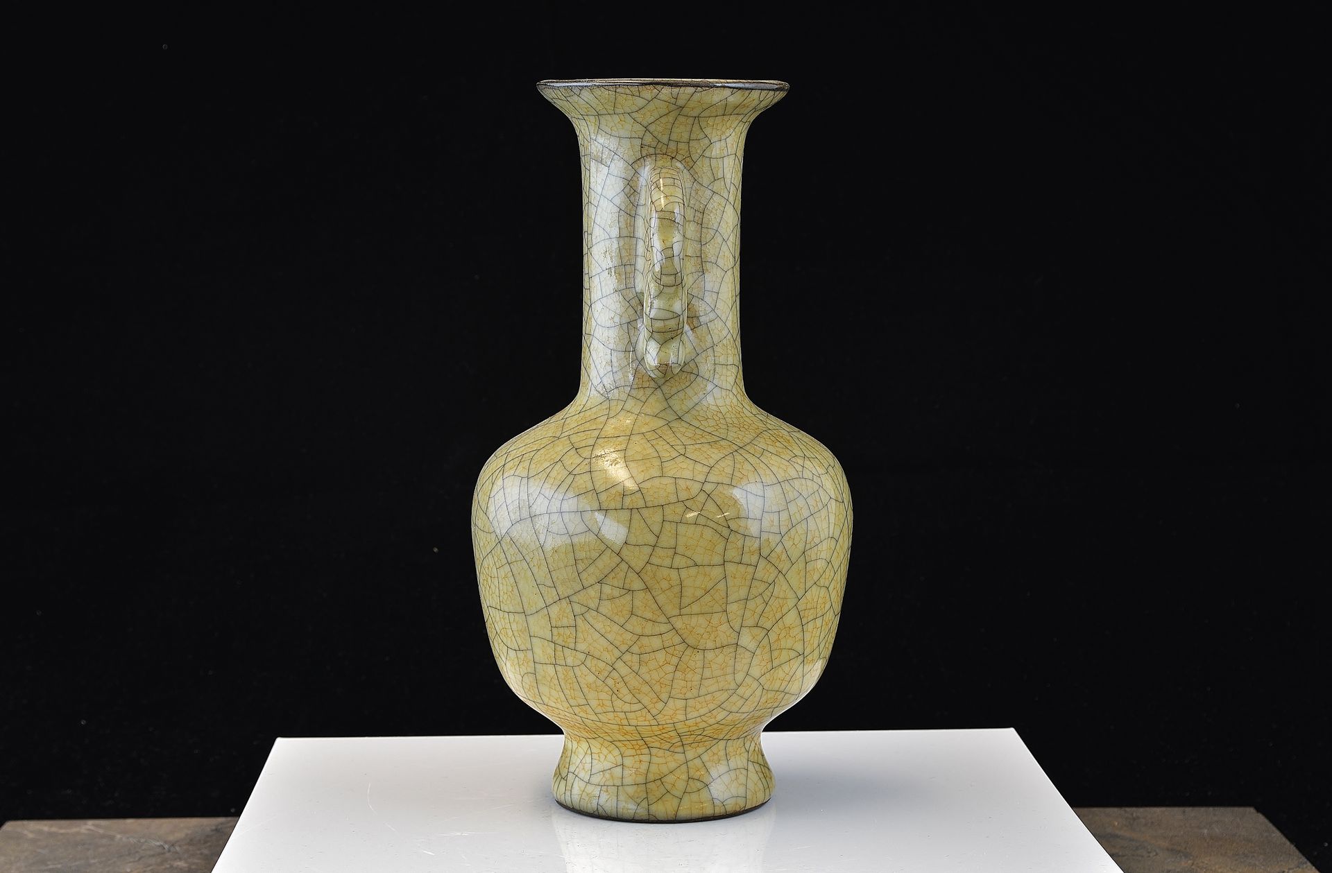Эта исключительная ваза Гэ, выполненная в стиле Fine Art, представляет собой один из самых почитаемых образцов изделий Гэ, когда-либо зафиксированных. Китайцы исторически характеризовали лучшие изделия Гэ цветом, напоминающим пшеницу, который дополнялся характерным фиолетовым ободом, где глазурь истончается, придавая лёгкий оттенок фиолетовому у горлышка. Кроме того, эти изделия известны своим железным основанием, которое хорошо видно на кольце основания. Это результат использования светло-коричневой глины с высоким содержанием железа, которая после обжига приобретает тёмно-коричневый оттенок. Узор из трещин часто описывается как напоминающий железную проволоку, обвитую золотой нитью, что придаёт им неповторимую эстетическую привлекательность. Печь Гэ, известная как печь старшего брата, процветала в эпоху династий Южная Сун и Юань. Эта ваза, вероятно, относится к категории подношений благодаря своему исключительному качеству, красоте и внушительному размеру – около 14 дюймов в высоту. ppjrs