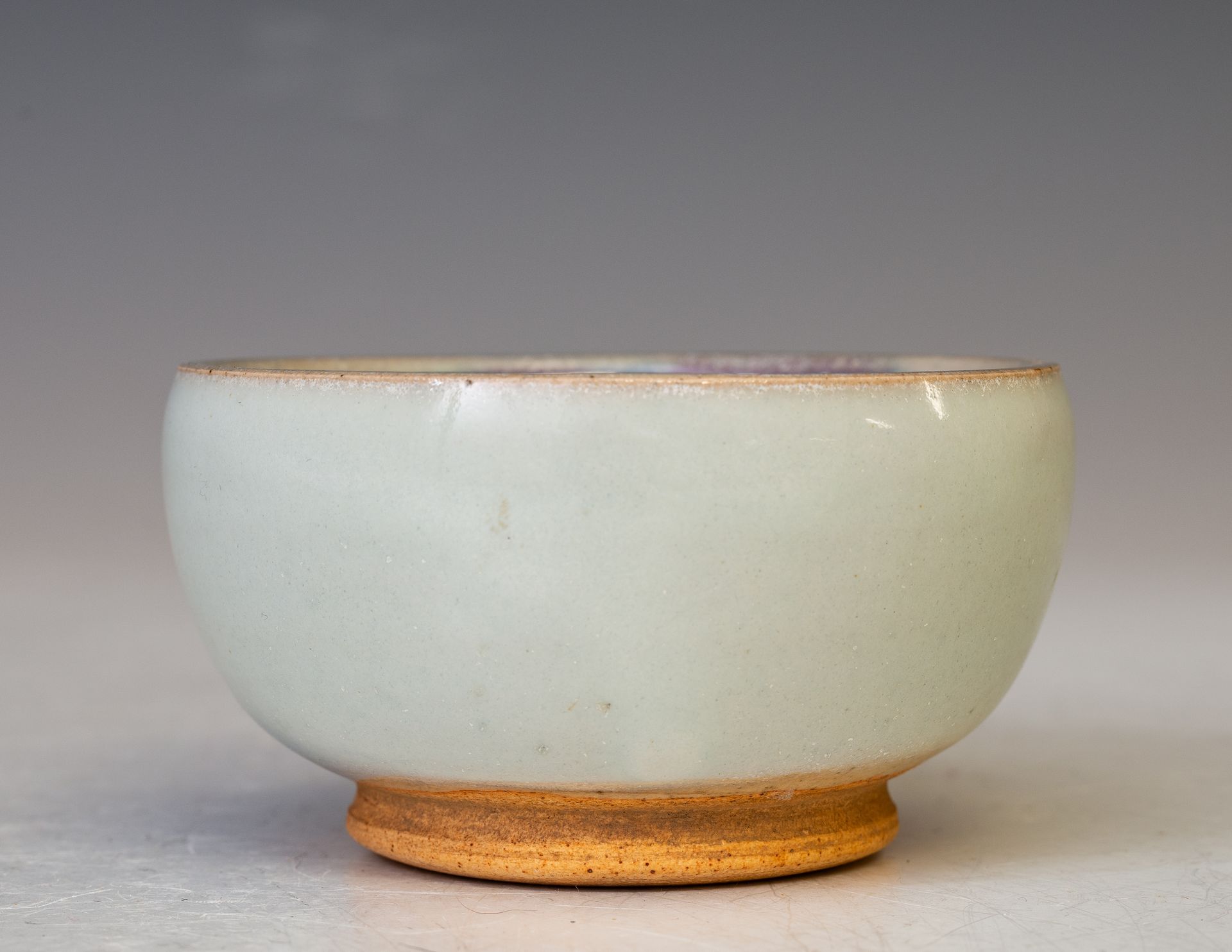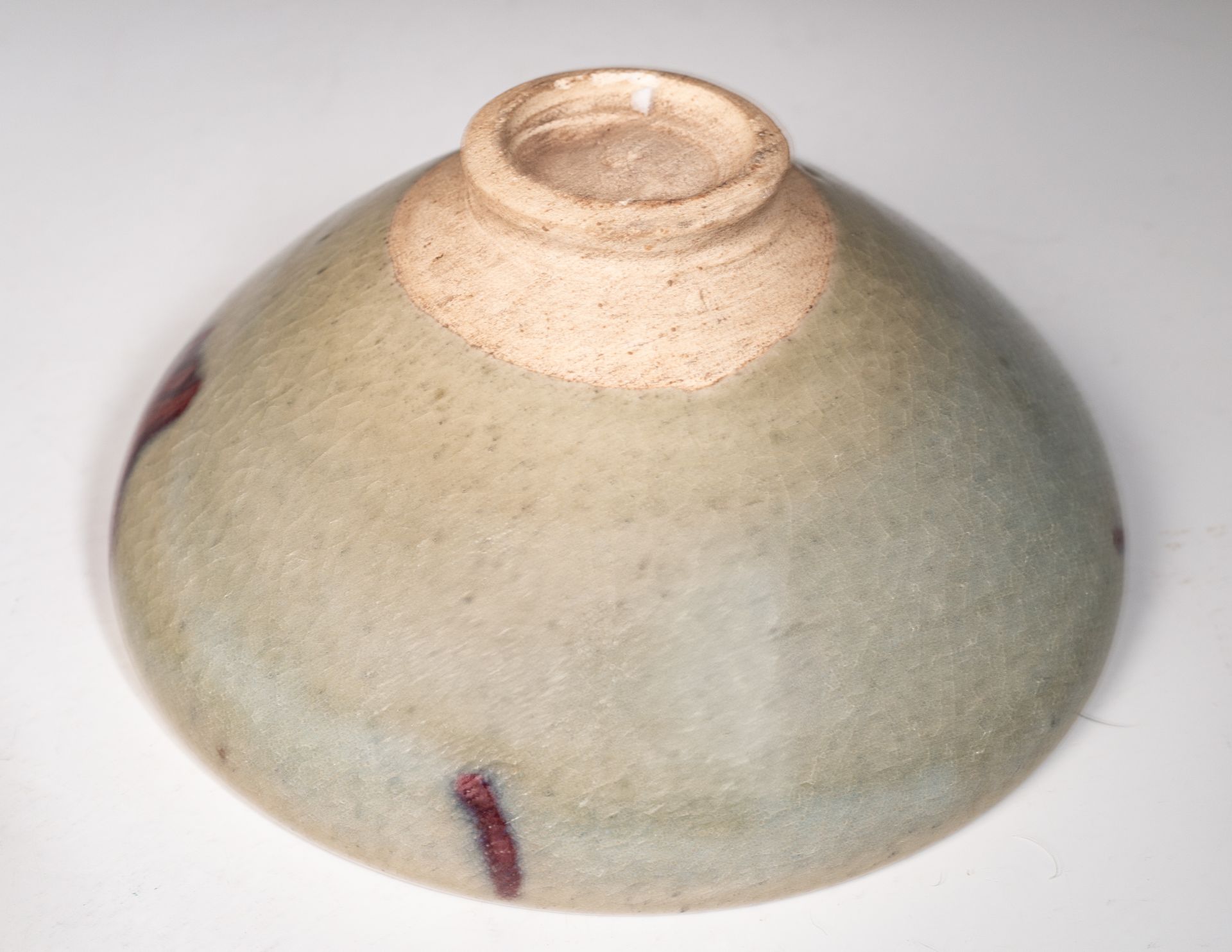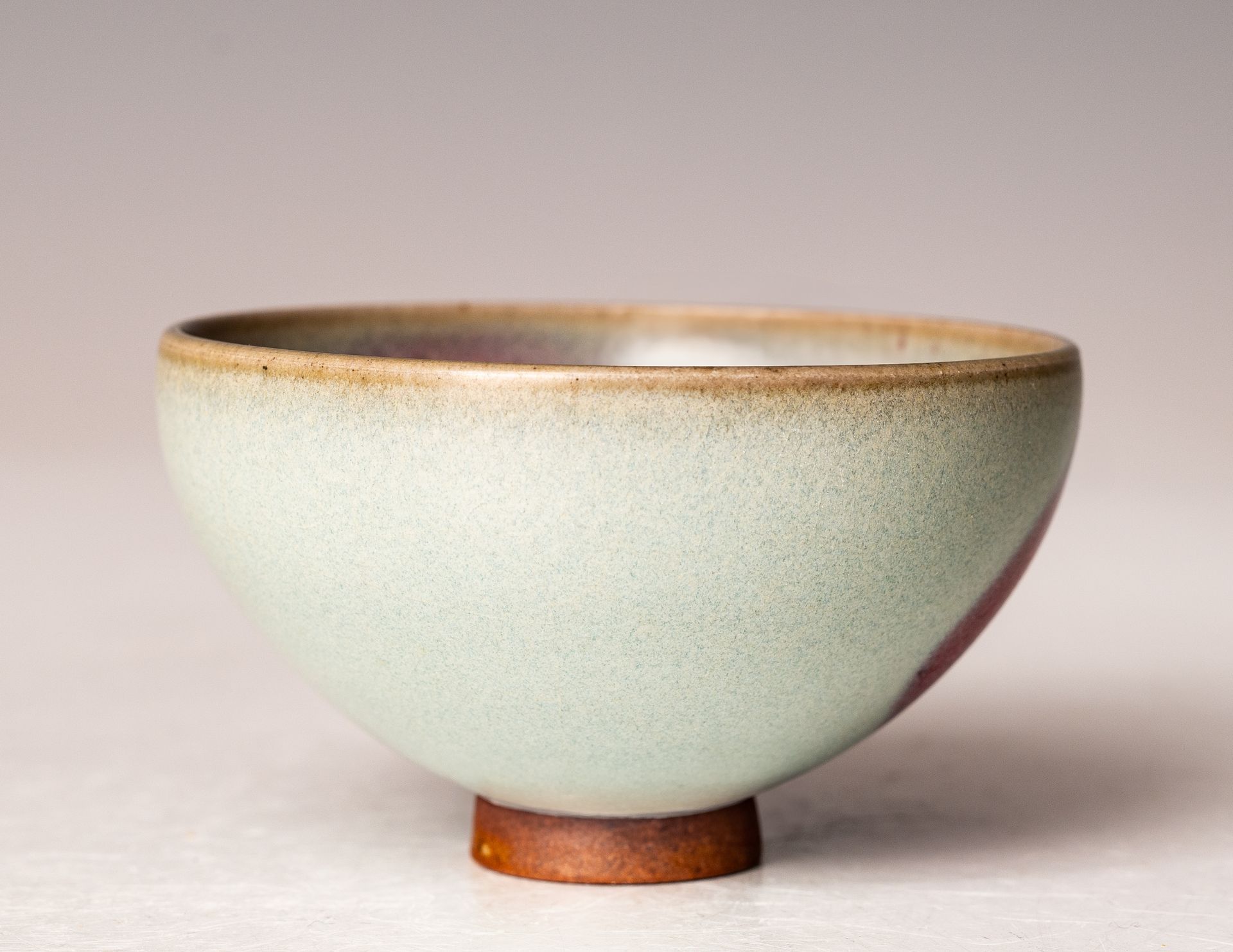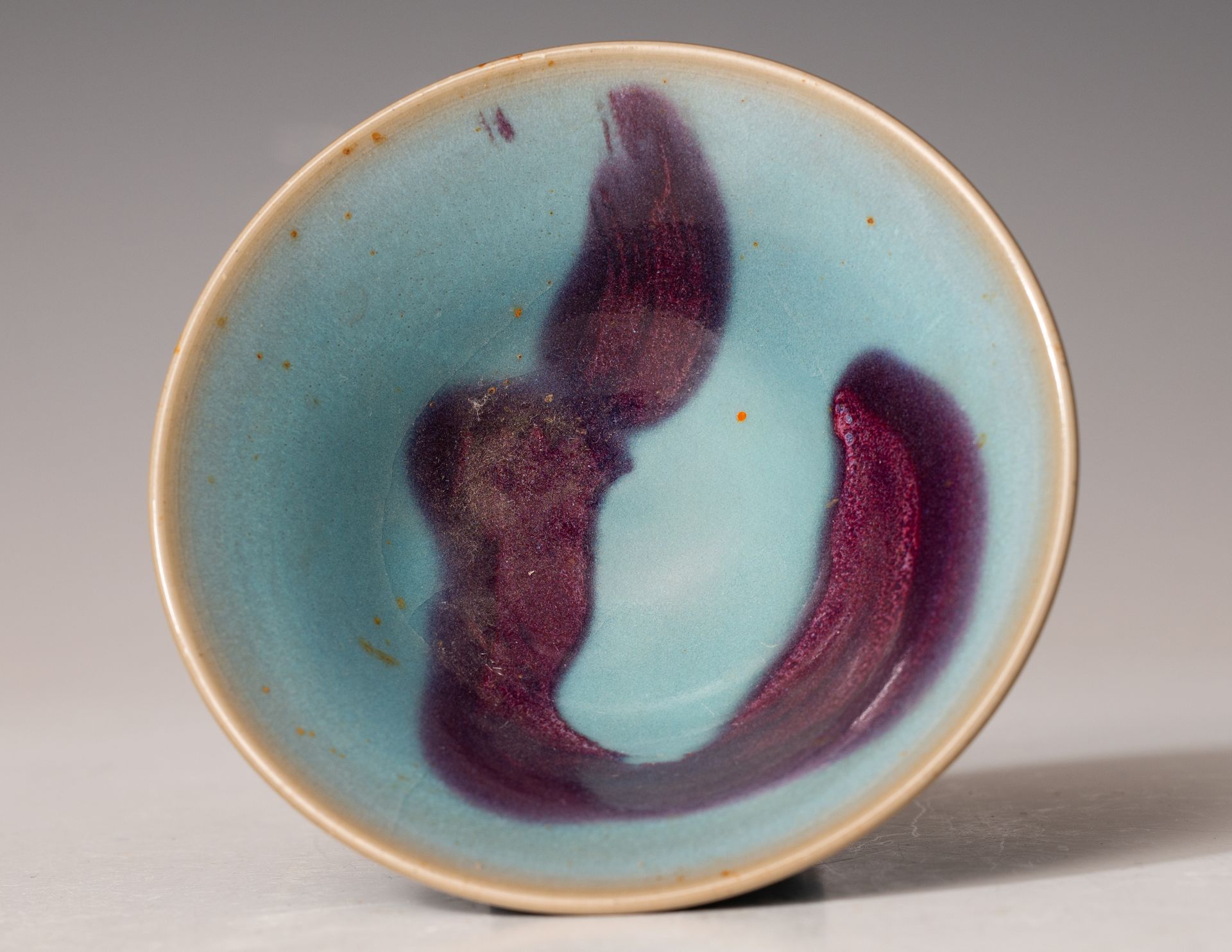 Эта коническая чаша эпохи династии Юань, характеризующаяся бледной голубовато-белой глазурью, украшена пурпурными вкраплениями как внутри, так и по краю. Глазурь плавно переходит в грибной оттенок у края. Диаметр чаши — 3,5 дюйма. ppjrs