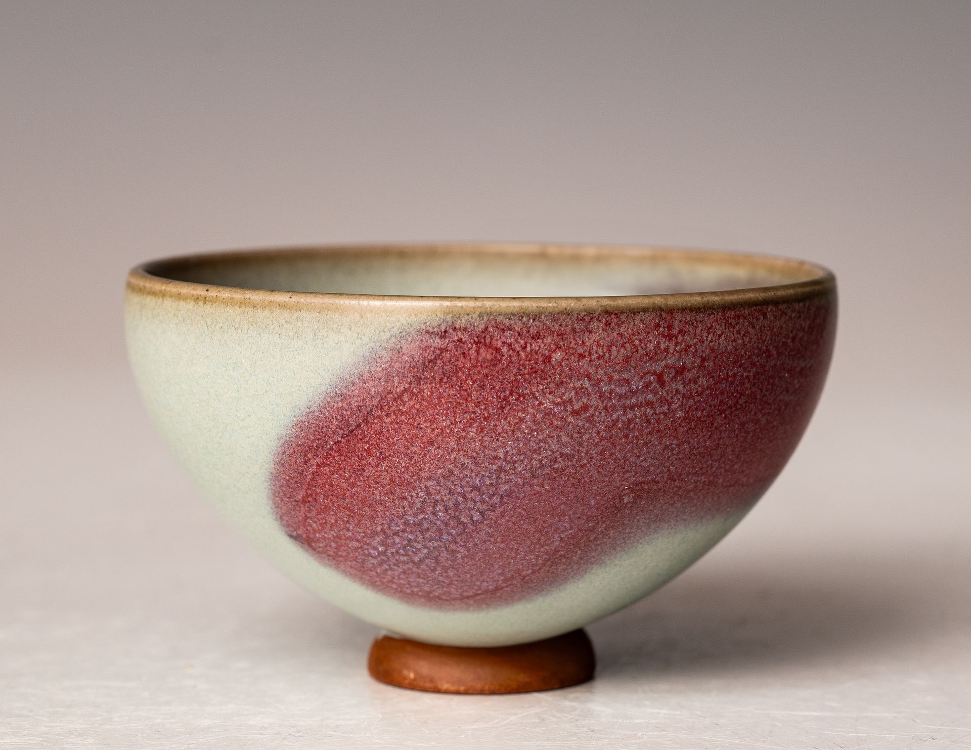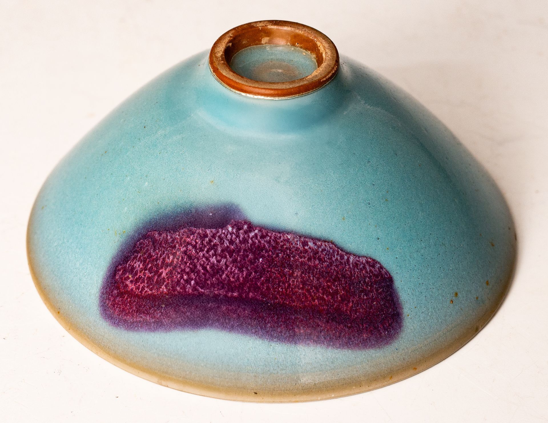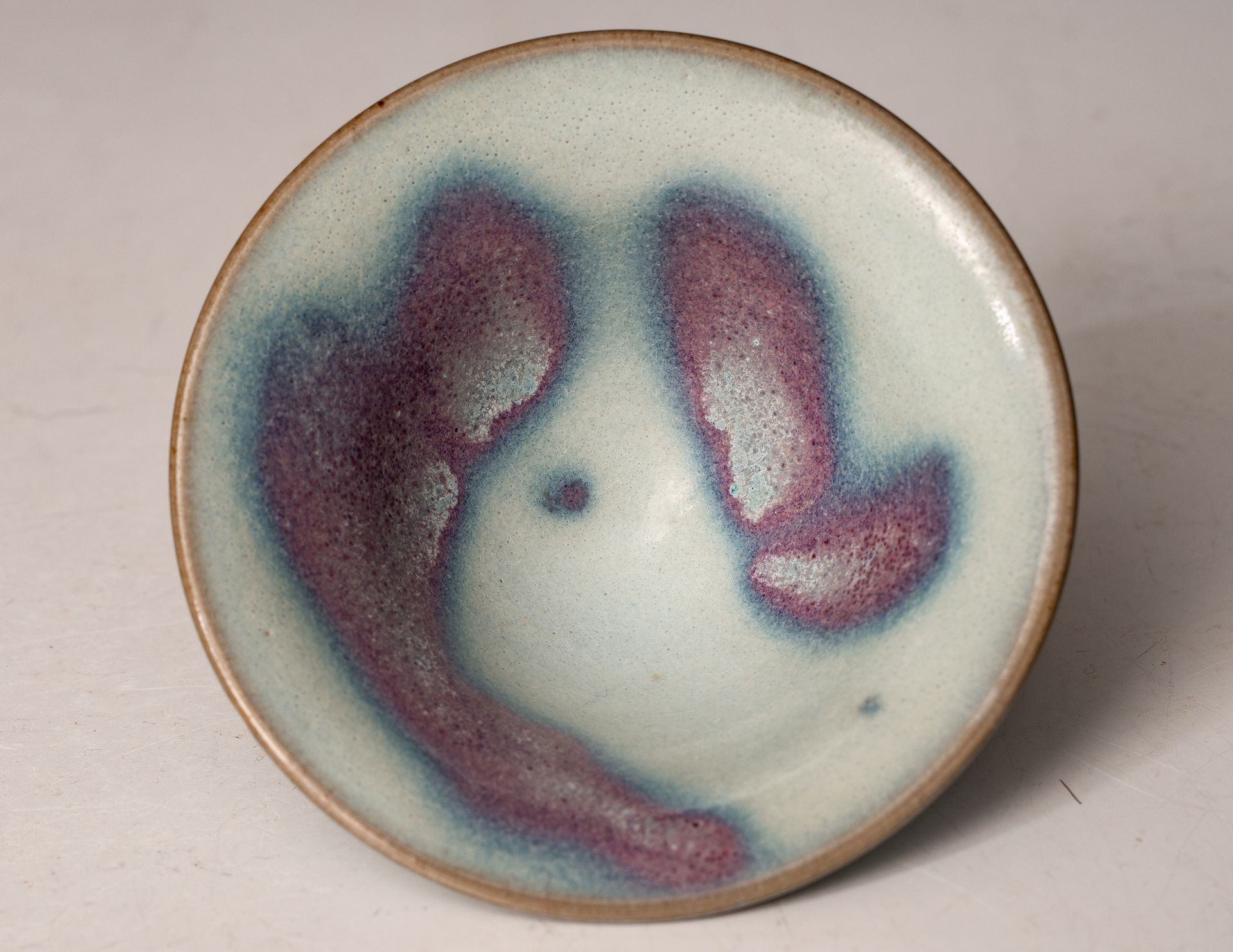 Династия Сун. Эта чаша украшена изнутри красновато-фиолетовым пятном на синем фоне и лёгким фиолетовым оттенком на внешней стороне обода, который сужается до грибного оттенка у края обода.