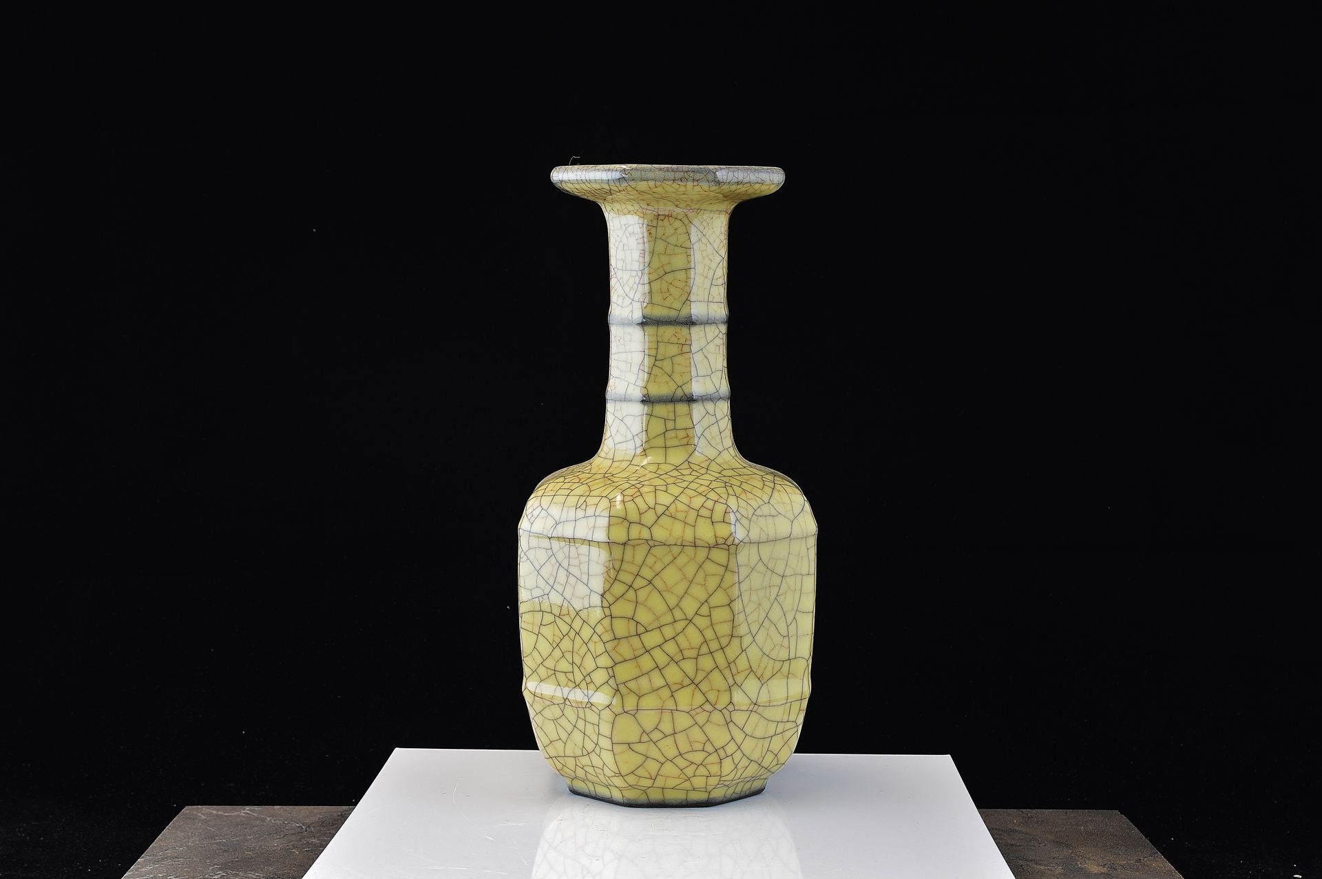 Печь Гэ эпохи династии Сун/Юань. Шестиугольная ваза в форме стрелы, украшенная тонкими потрескивающими нитями крови угря, с железным основанием, напоминающим цвет пшеницы. Печь Гэ, признанная ведущей печью от Южной Сун до династий Юань, имеет высоту около 25 см. ppjrs