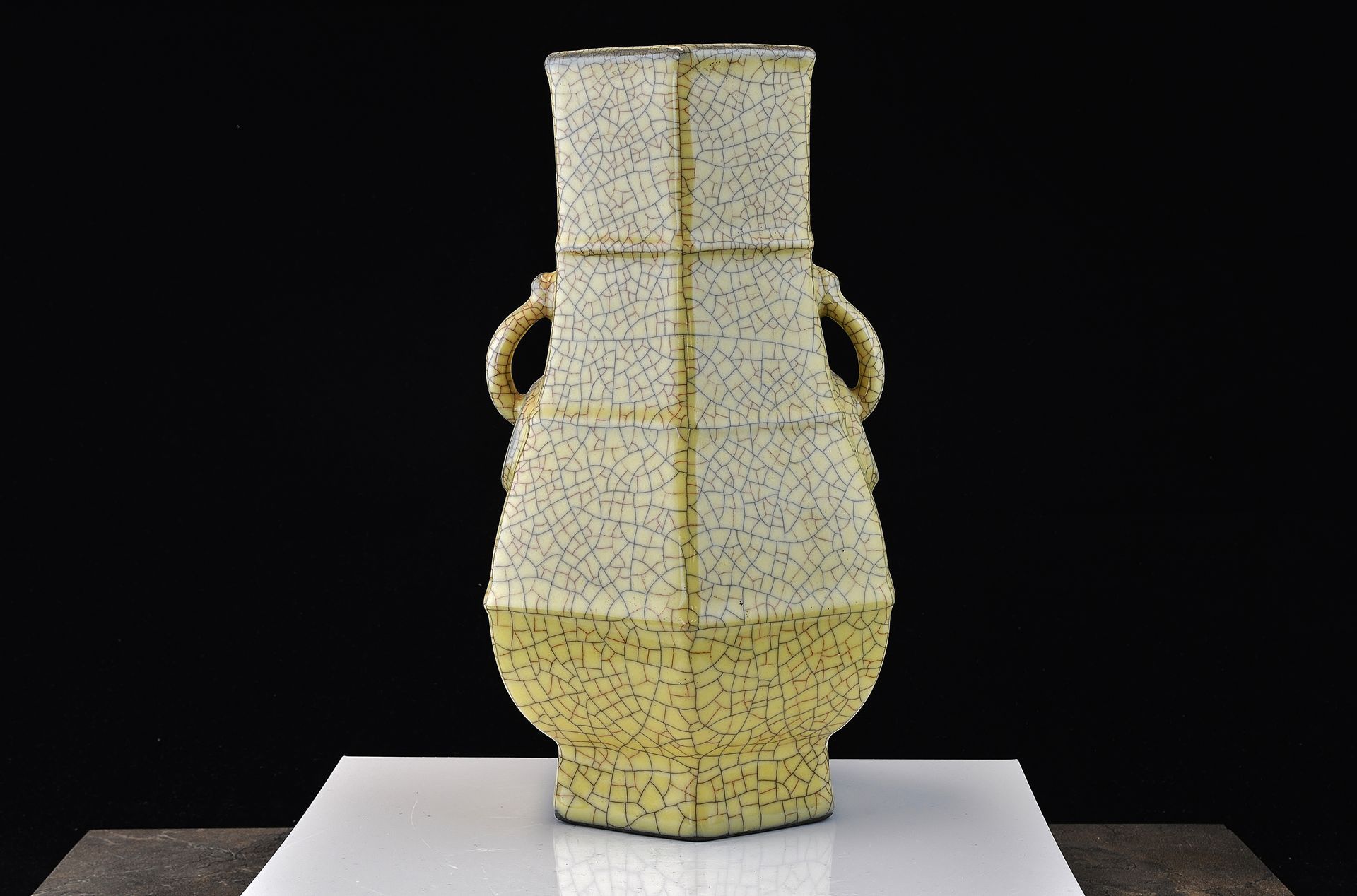 Восьмиугольная ваза в форме ху с трубчатыми ручками, изготовленная в печи Гэ эпохи Южной Сун/Юань, вероятно, в начале периода Южной Сун. Процесс обжига этого изделия отличается неоднородностью: глазурь заметно толще из-за ограничений, связанных с эксплуатацией печи в то время. Ваза имеет железное основание и цвет, напоминающий пшеницу. Печь Гэ, часто называемая «печью старшего брата», имеет историческое значение в период перехода от Южной Сун к Юань. Высота этой вазы составляет около 7 1/2 дюймов (19 см). ppjrs