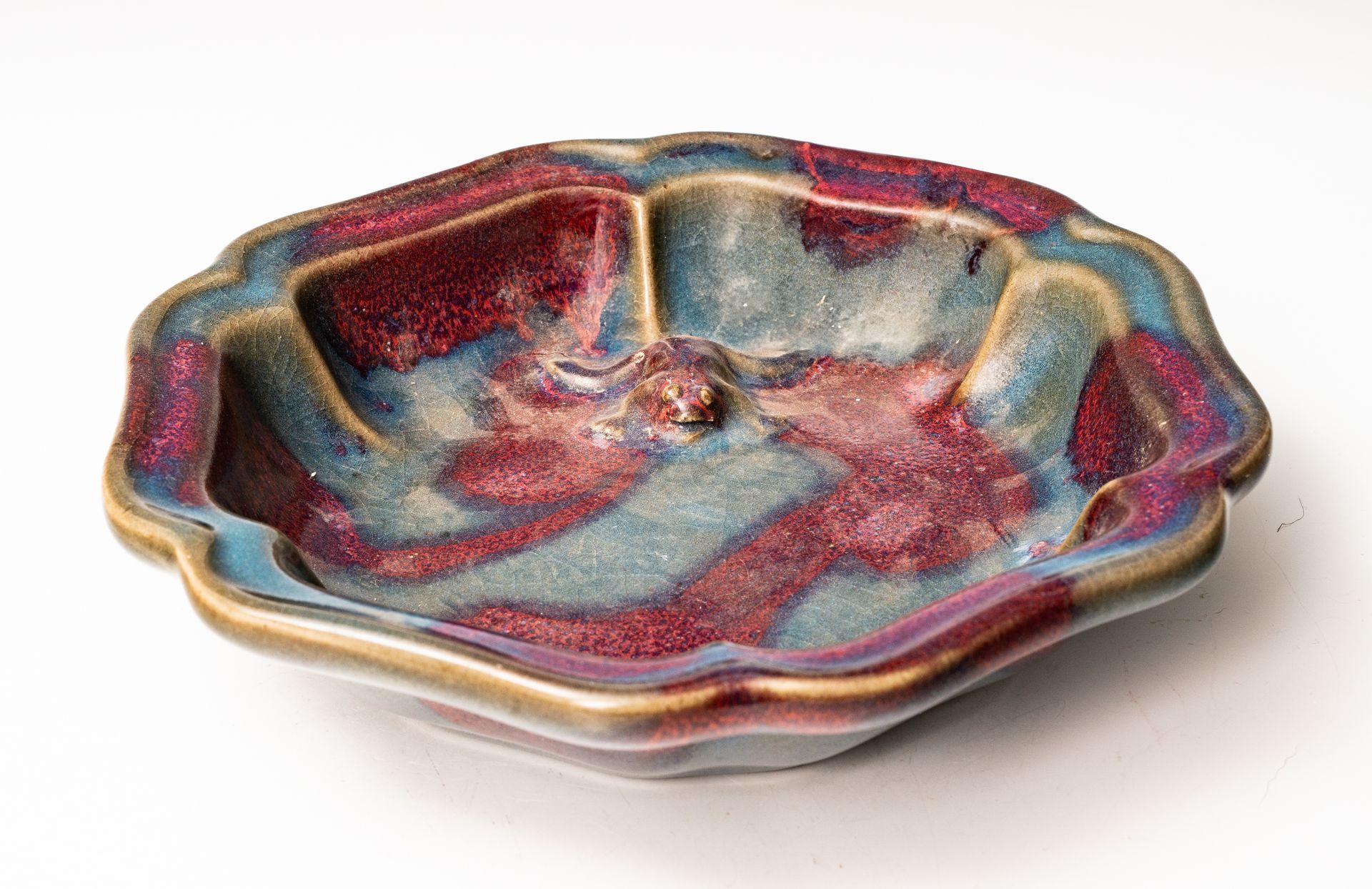Эта замечательная восьмиугольная кистевидная чаша эпохи династии Северная Сун отличается ярким синим оттенком, украшенным красновато-фиолетовыми брызгами как на внутренней, так и на внешней поверхности. Примечательно, что на внутренней стороне изображен мотив лягушки, что усиливает художественную привлекательность изделия. Глазурь изящно истончается, переходя в грибной оттенок по краю и краям. Диаметр этого изысканного изделия составляет 8 1/4 дюйма (21,5 см). ppjrs