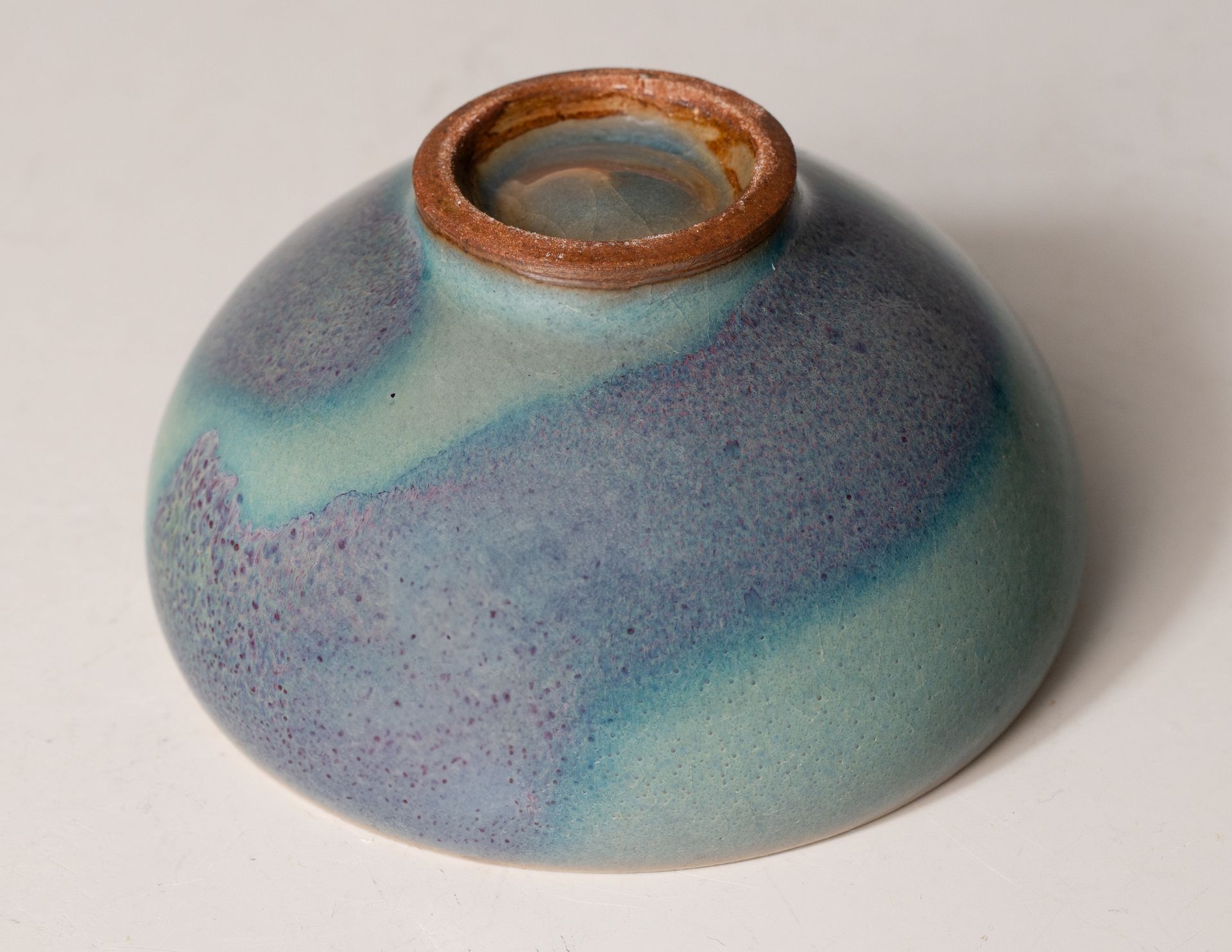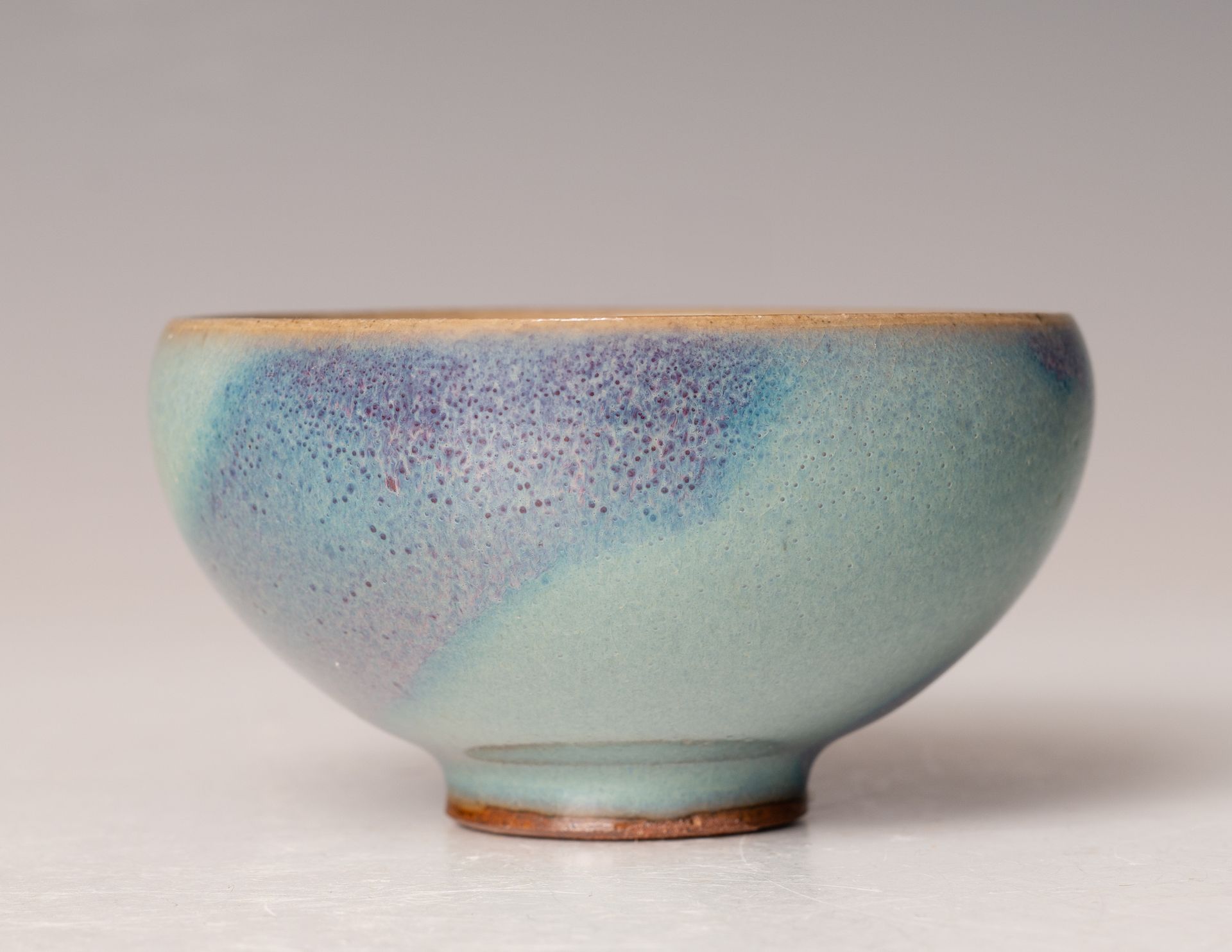 Эта бледно-голубоватая чаша эпохи династии Юань, выполненная в стиле Цзюнь, украшена пурпурными вкраплениями и зеленоватым оттенком как на внутренней, так и на внешней стороне обода. Кроме того, лёгкий фиолетовый оттенок подчёркивает край обода. Диаметр чаши составляет 3 3/16 дюйма (8,7 см). ppjrs