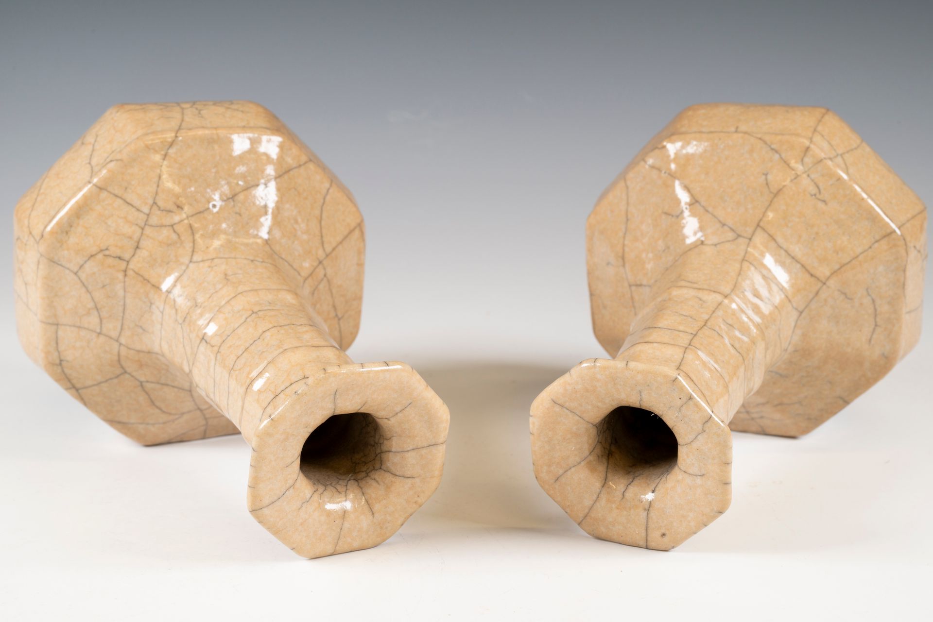 Эта исключительная пара восьмиугольных ваз в стиле гэ представляет собой один из самых редких образцов изящной керамики, когда-либо задокументированных. Характерные пшеничный оттенок и изящная тонкая керамика, эти вазы демонстрируют искусную работу. В частности, гэ отличается железным основанием, заметным на кольце основания, что обусловлено использованием светло-коричневой глины с высоким содержанием железа, которая темнеет при обжиге. Поверхностный узор трещин описывается как напоминающий железную проволоку, переплетенную с золотыми нитями. Печь гэ, часто называемая печью старшего брата, работала в период династии Южная Сун и вплоть до династии Юань. Эти вазы высоко ценятся как редкие артефакты, вероятно, изготовленные в эпоху династии Южная Сун, что объясняется более ранним, менее совершенным процессом обжига, который привел к более толстому слою глазури в результате развития производственных технологий. Высота каждой вазы составляет около 8 3/4 дюймов (21,5 см), что подчеркивает их значимость в истории китайской керамики.