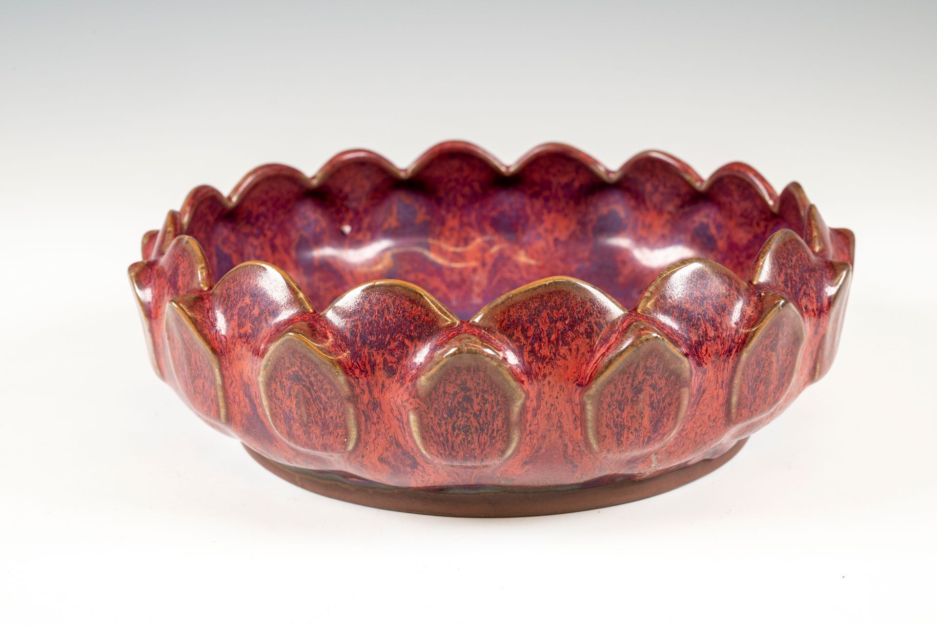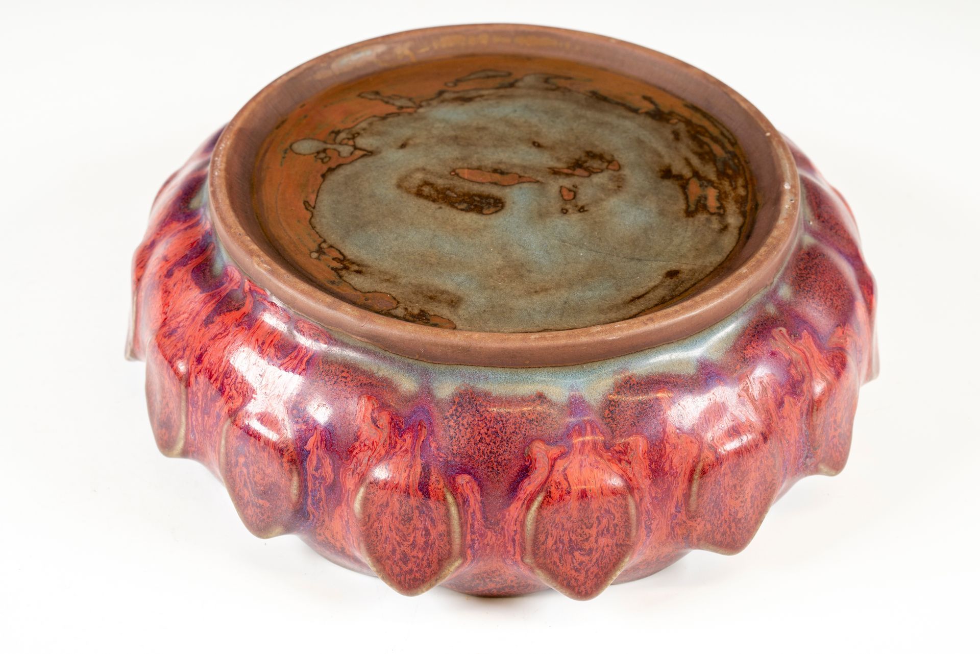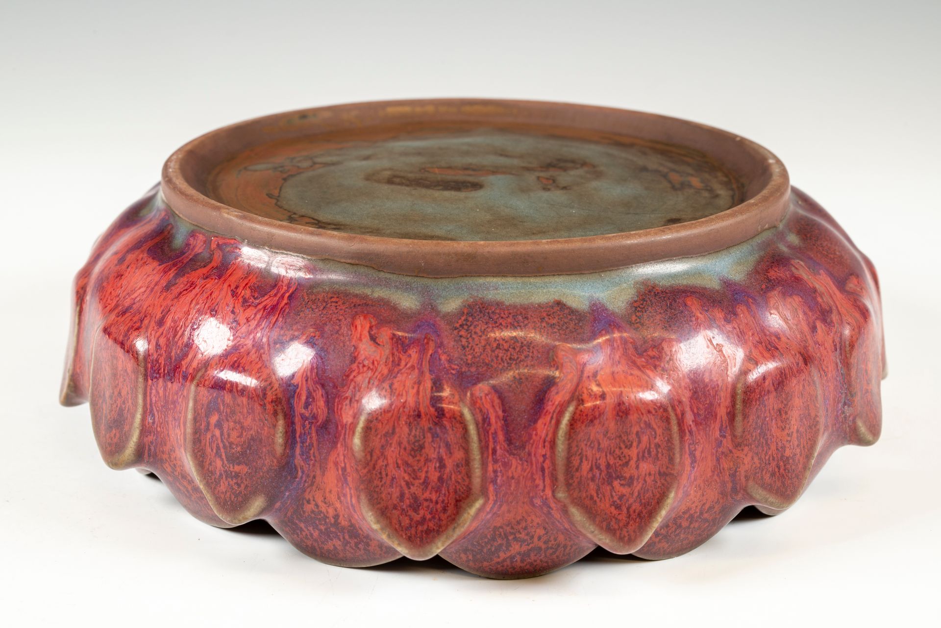 Мочалка для кистей из керамики Цзюнь, приписываемая династии Северная Сун, украшена узором, вдохновлённым листьями лотоса. Этот изысканный предмет отличается характерным коричневатым оттенком с красноватыми и пурпурными оттенками, которые слегка синеют. Диаметр изделия составляет около 8 дюймов. ppjrs
