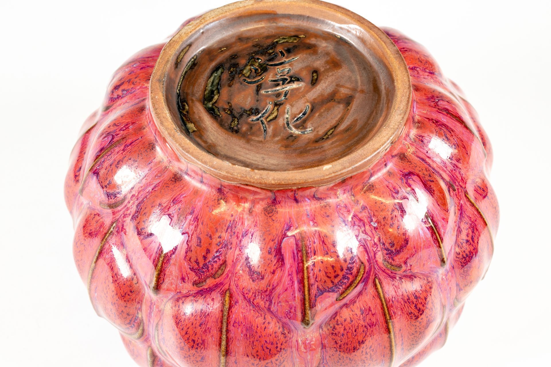 Редкий архаичный сосуд в форме дина, изготовленный в начале династии Мин, из печи Цзюнь, с надписью. Эта красновато-голубоватая курильница покрыта изнутри глазурью цвета яйца малиновки, на которой видны следы времени, такие как следы червей, и надпись на основании. Высота сосуда составляет около 8 1/2 дюймов (21,5 см). ppjrs