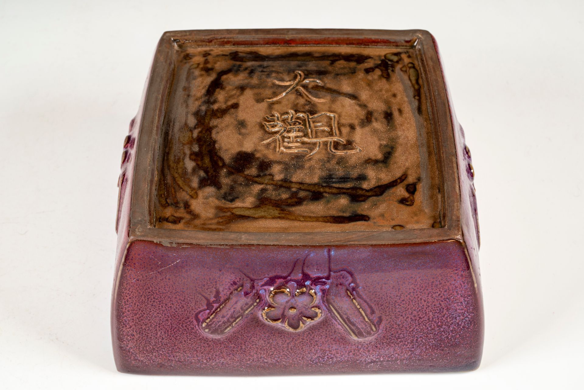 Квадратная щёточная мойка Jun Kiln Jun эпохи Южной династии Сун с коричневатой накладкой. Внешняя поверхность имеет пурпурный оттенок, а внутренняя — характерный синий цвет, напоминающий яйцо малиновки. Примечательно, что как на внутренней, так и на внешней поверхности видны уникальные следы червей. Длина изделия составляет около 6 1/2 дюймов (17,5 см). ppjrs