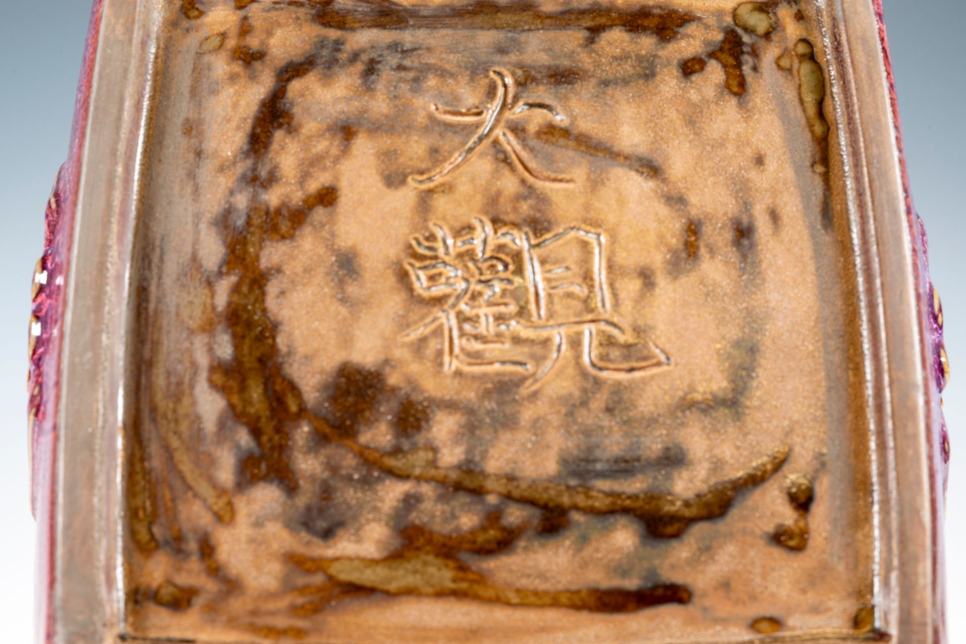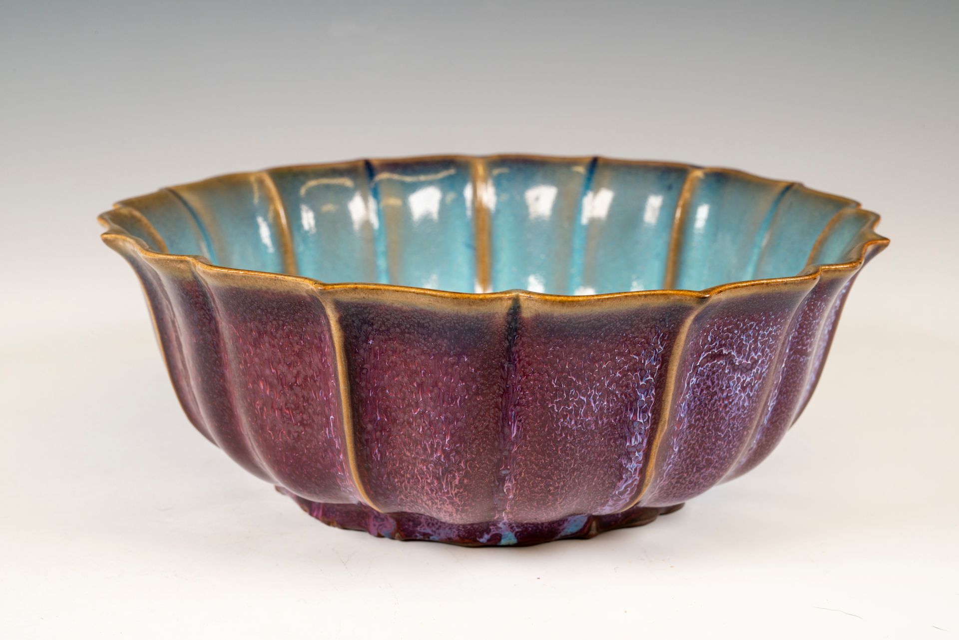 Этот изысканный сосуд ранней династии Мин имеет восьмиугольную форму эпохи Цзюнь, характерную для эпохи фиолетово-голубой глазури, подчеркнутой красноватым оттенком под краем снаружи. Внутренняя часть имеет нежный светло-голубой оттенок, а в местах, где глазурь становится тоньше, нанесен темно-коричневый шликер, включая темно-коричневый ободок и края. Примечательно, что на внутренней поверхности видны следы червей. Дно украшено тремя иероглифами. Диаметр сосуда составляет 9 1/8 дюйма (23,7 см). ppjrs