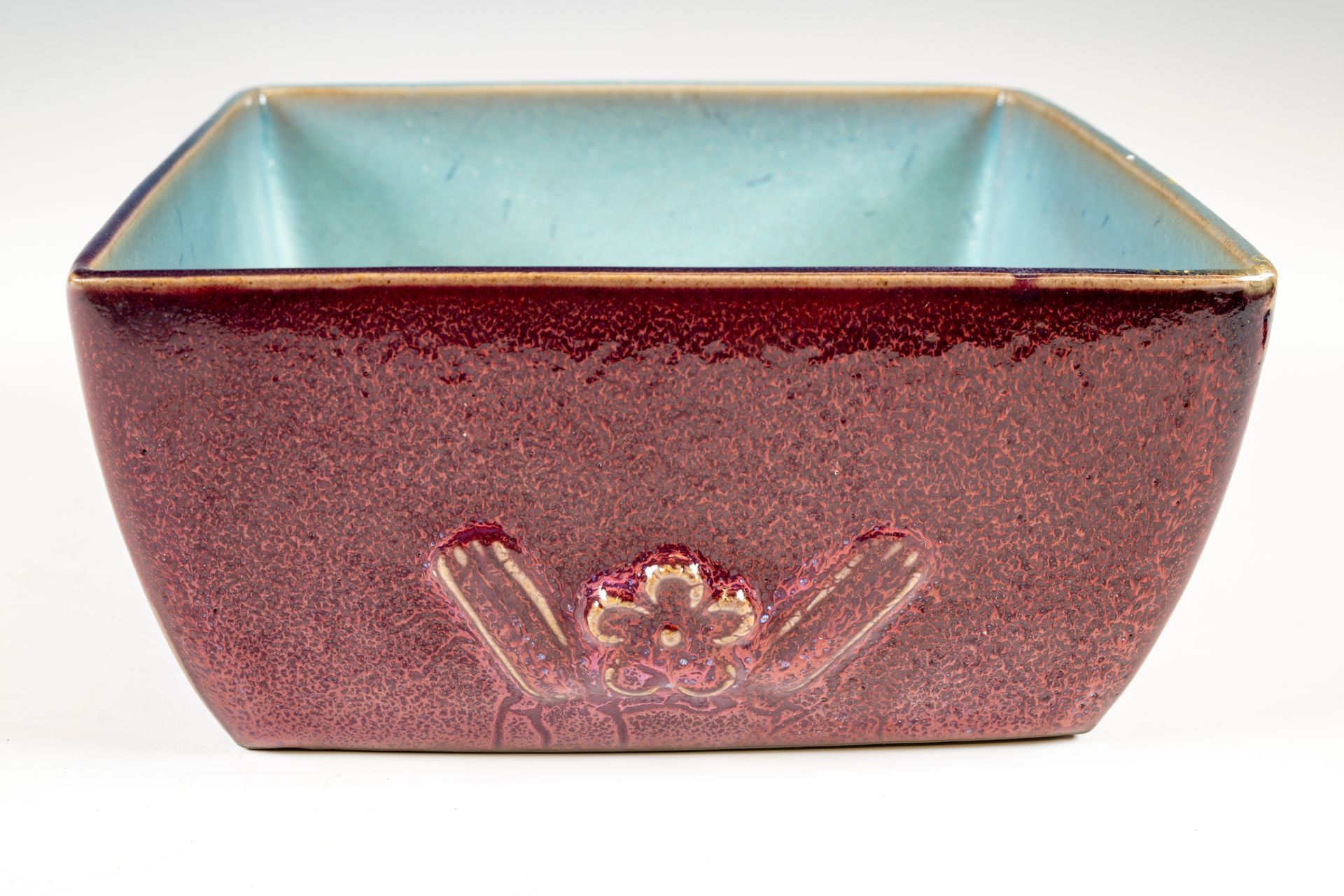 Эта квадратная щёточная мойка эпохи династии Сун в стиле цзюнь отличается характерным коричневатым отливом. Внешняя поверхность имеет пурпурный оттенок, а внутренняя поверхность – пленительный синий цвет яйца малиновки, дополненный едва заметным потрескиванием и следами червей на основании. Диаметр изделия составляет около 6 5/8 дюйма (16,5 см).