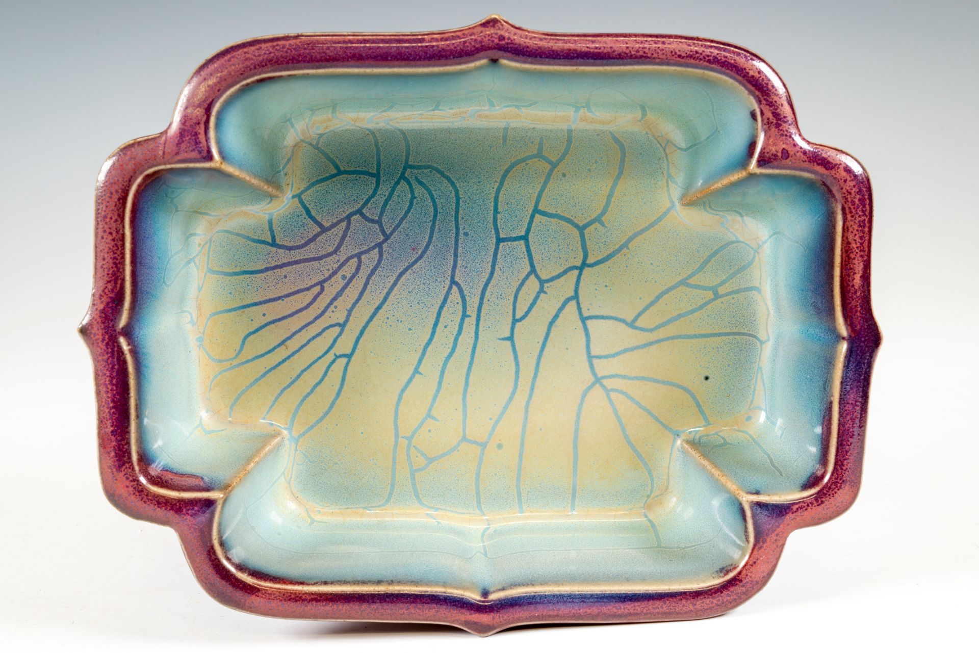 Цветочный горшок и блюдо из цзюньской керамики эпохи династии Сун с красноватой глазурью и синей внутренней поверхностью, украшенной следами червей