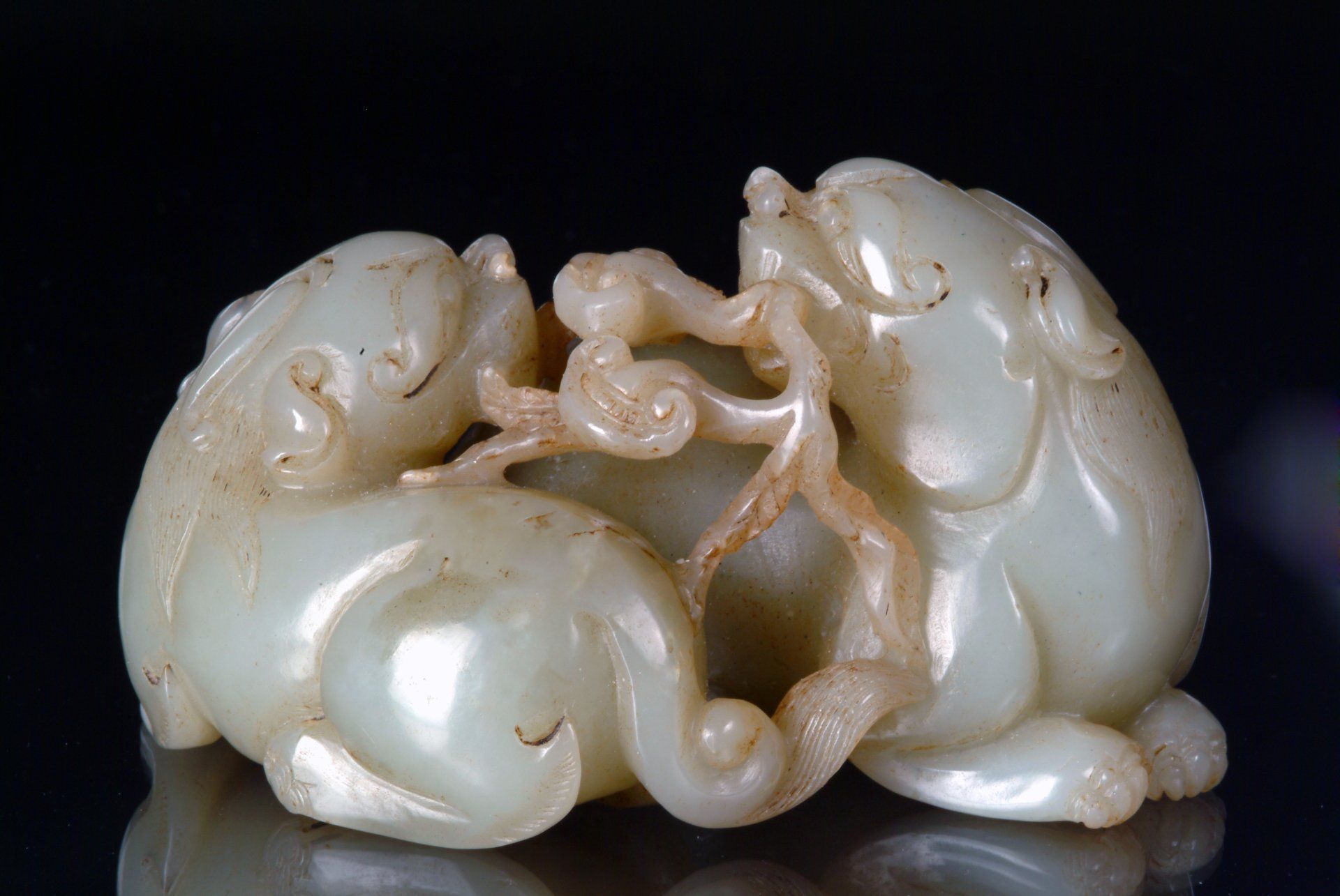 Статуэтки мифических рогатых зверей из серого нефрита эпохи династии Мин