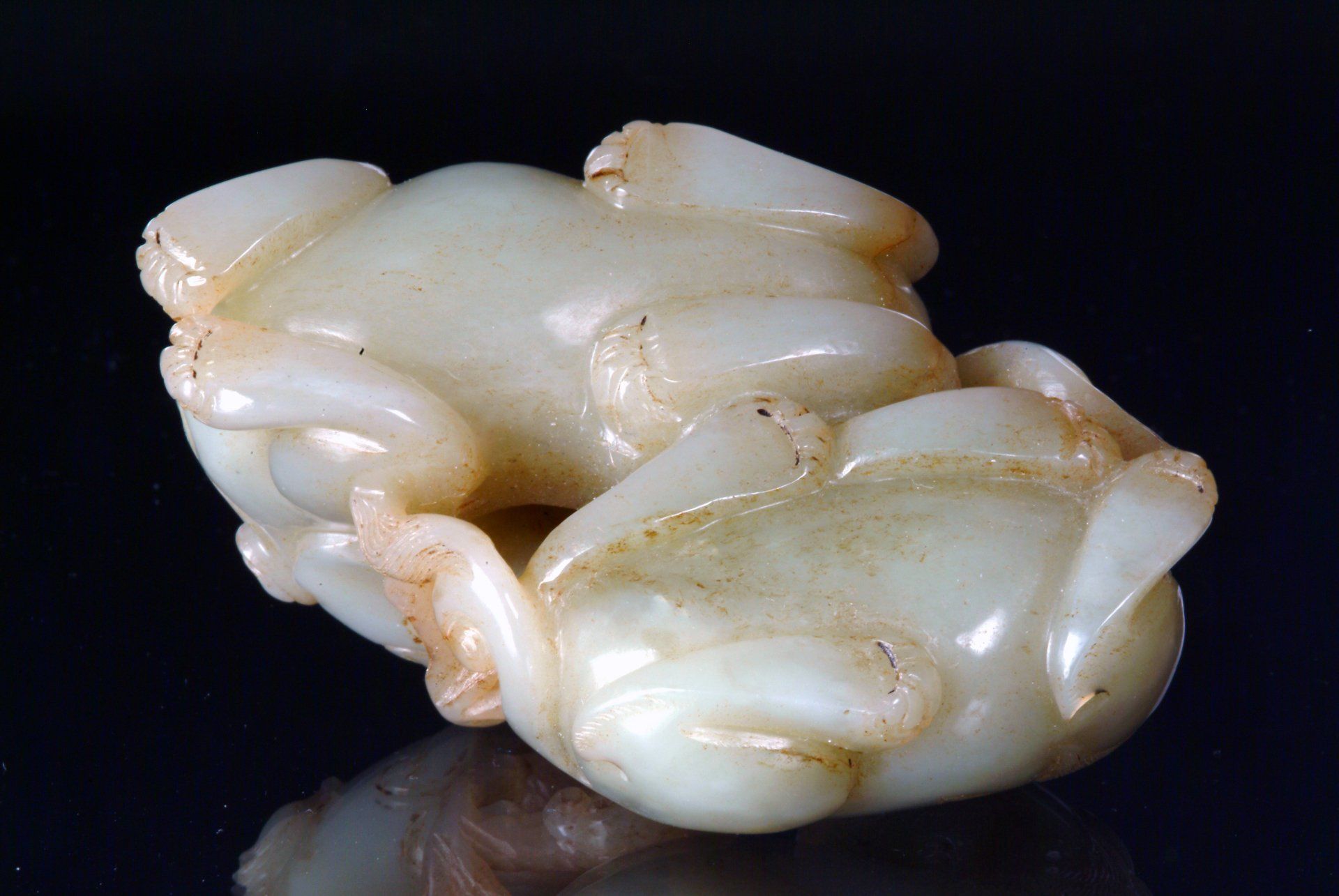 Статуя птицы из селадонового нефрита эпохи династии Мин со сколотым пальцем. На изделии присутствуют значительные коричневые и красновато-коричневые включения, а изысканность резьбы подтверждает её древность. Размеры статуи