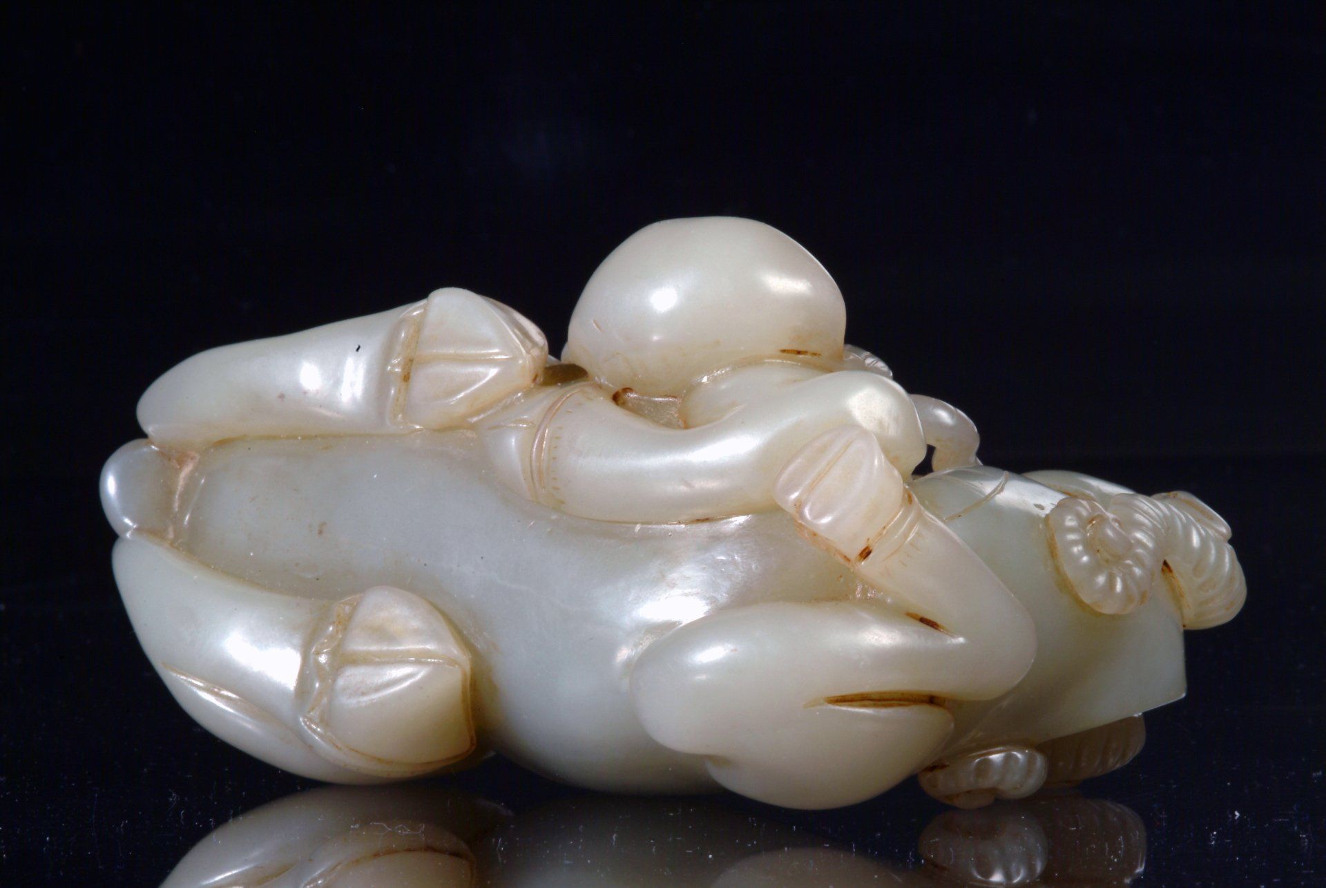 Эта изысканная серовато-белая нефритовая скульптура эпохи династии Мин изображает искусно вырезанное мифическое животное со всадником. Стиль резьбы, отличающийся облачными образованиями и коричневыми вкраплениями, несомненно подтверждает её историческую подлинность. Длина изделия составляет около 4 1/4 дюйма (11,7 см).