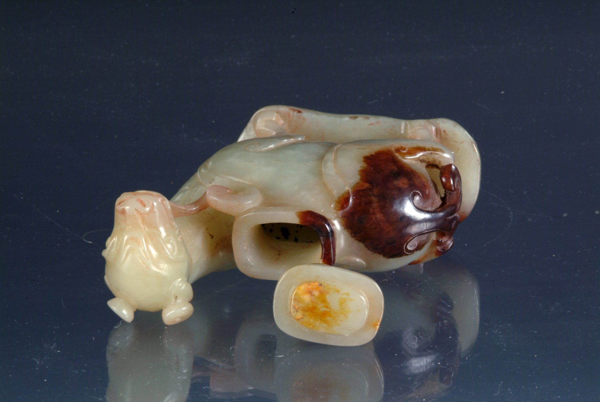 Тщательно изготовленный сосуд для воды из серовато-белого нефрита с изображением мифического животного эпохи династии Мин, с заметными коричневато-красными включениями, указывающими на его древность. Использованный стиль резьбы дополнительно подтверждает его историческую значимость. Длина изделия составляет около 3,5 дюймов (9,7 см).
