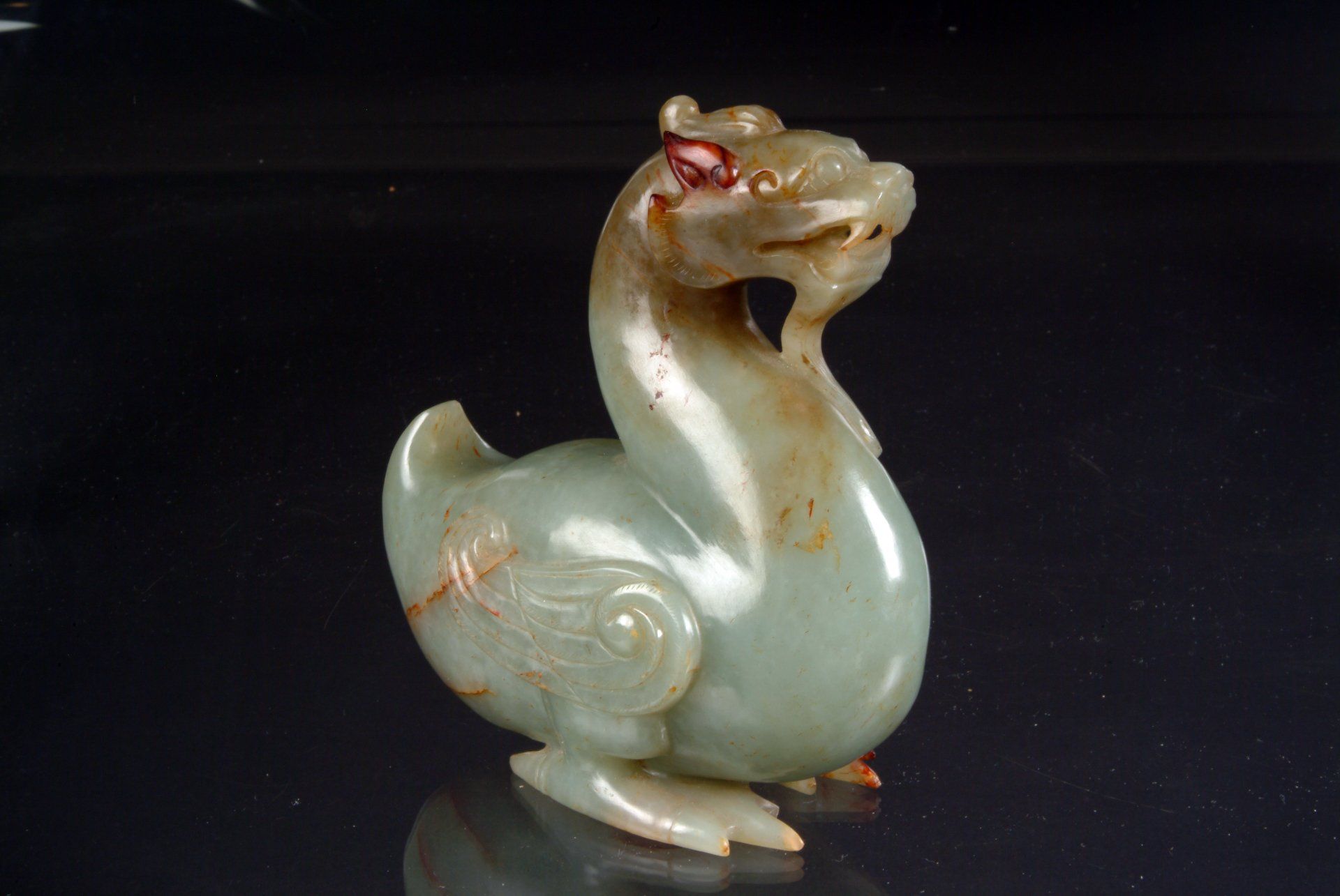 Эта искусно вырезанная из селадонового нефрита статуэтка утки, относящаяся к эпохе династии Мин, украшена изображением головы дракона. Изделие отличается характерными коричневатыми включениями и красновато-коричневыми прожилками, что ещё раз подтверждает его историческую значимость. Высота статуи составляет около 11,5 см.