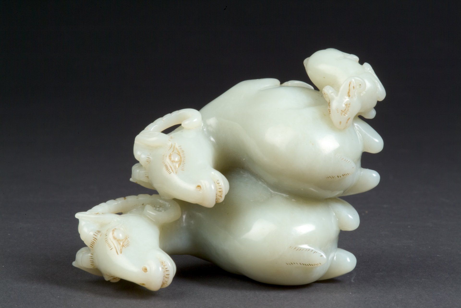 Эта искусно выполненная статуя, изображающая группу из трёх лежащих баранов эпохи династии Мин, изготовлена из белого нефрита. На изделии видны помутнения, указывающие на его возраст, а также следы износа и стиль резьбы, соответствующий этому историческому периоду. Размеры статуи составляют приблизительно 6,5 см в ширину.