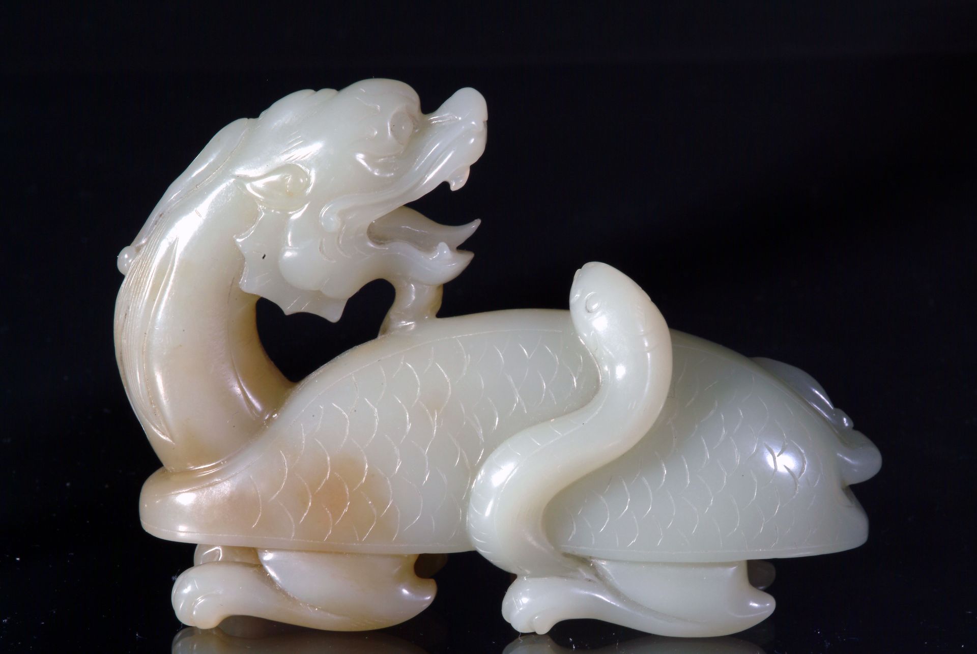 Эта искусно выполненная серовато-белая нефритовая статуя эпохи династии Цин изображает мифическую рыбу в сопровождении мальчика. На изделии видны лёгкие помутнения, а характерный стиль резьбы свидетельствует о его исторической значимости. Длина статуи составляет около 3,75 дюйма (9,7 см).