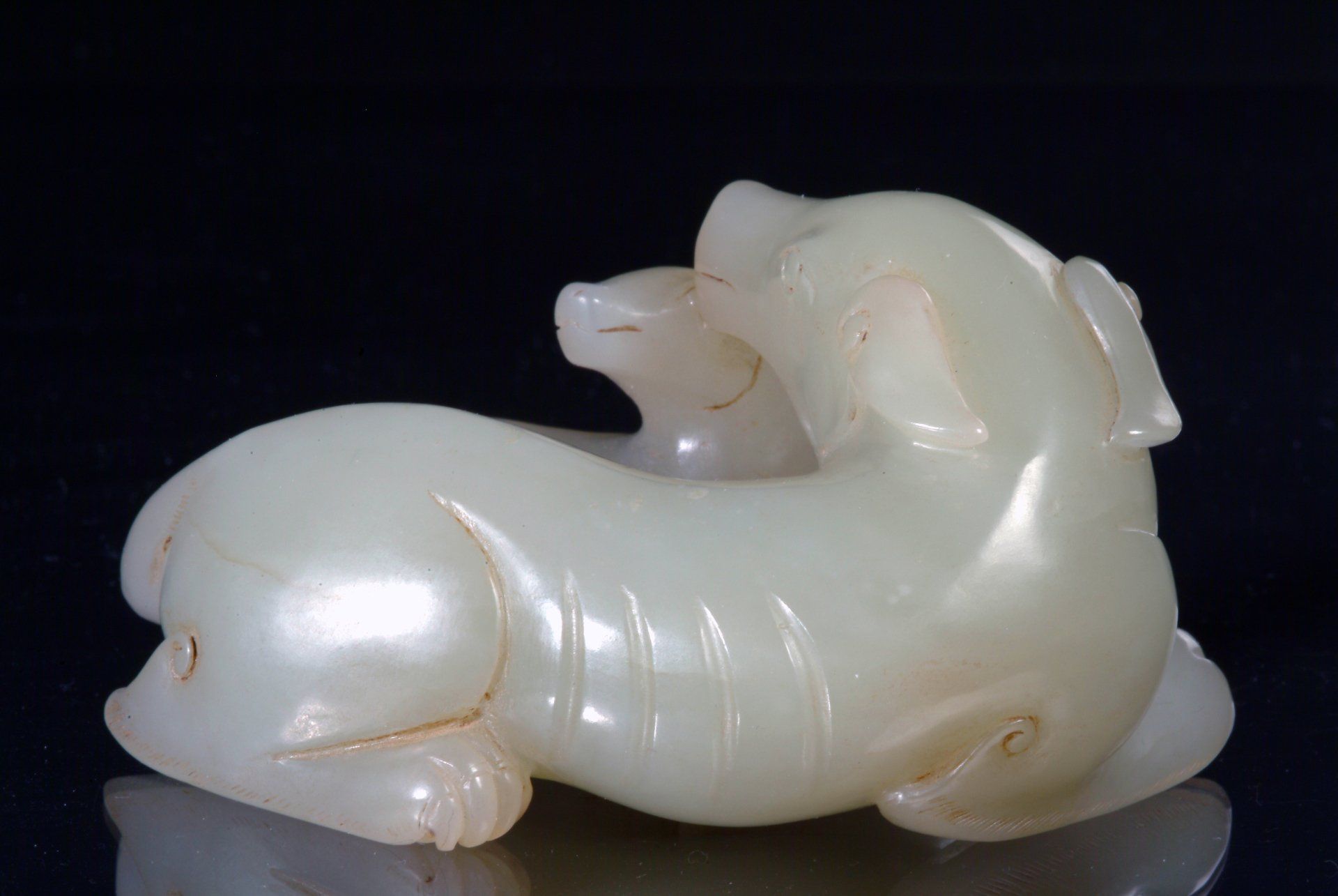 Полупрозрачная белая нефритовая статуэтка гончей и щенка из династии Цин