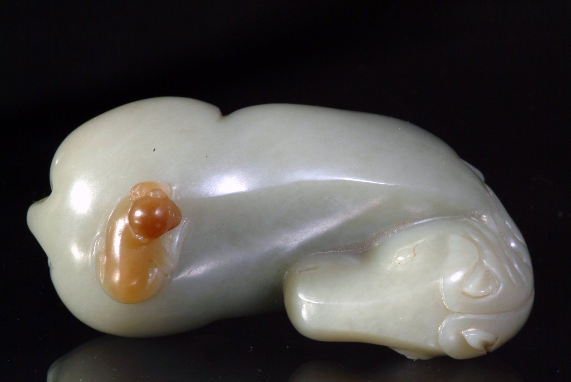 Эта изысканно выполненная скульптура из зеленовато-серого нефрита эпохи династии Цин изображает лошадь в сопровождении обезьяны. Примечательная коричневая тональность изображения обезьяны, мастерство и техника резьбы однозначно подтверждают период её создания. Общие размеры скульптуры составляют около 3 3/4 дюйма (9,7 см) в длину.