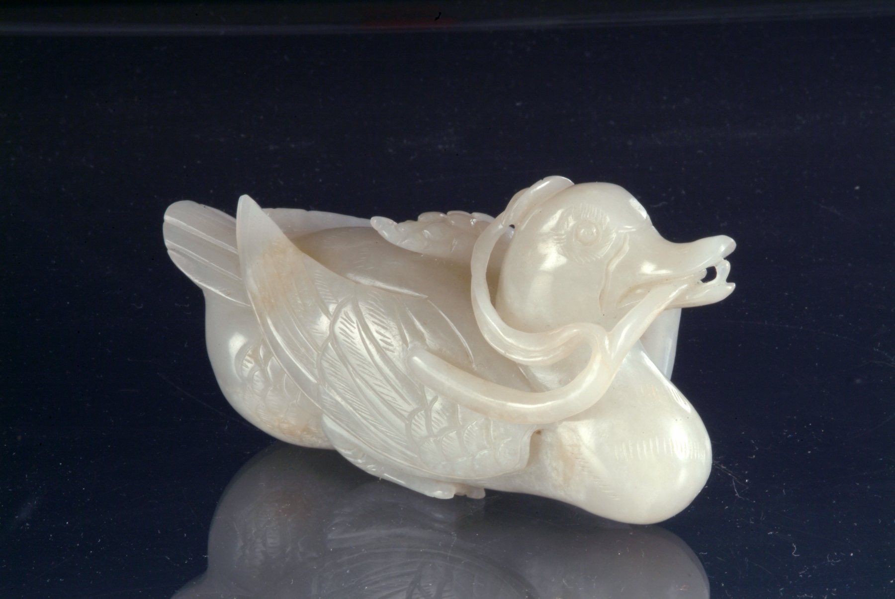 Эта искусно вырезанная из белого нефрита статуэтка династии Цин, изображающая уток в окружении колосьев пшеницы, демонстрирует заметные мутные пятна, характерные для её возраста. Мастерство исполнения свидетельствует о высоком уровне мастерства той эпохи. Длина статуи составляет около 4,5 дюймов (11,5 см).