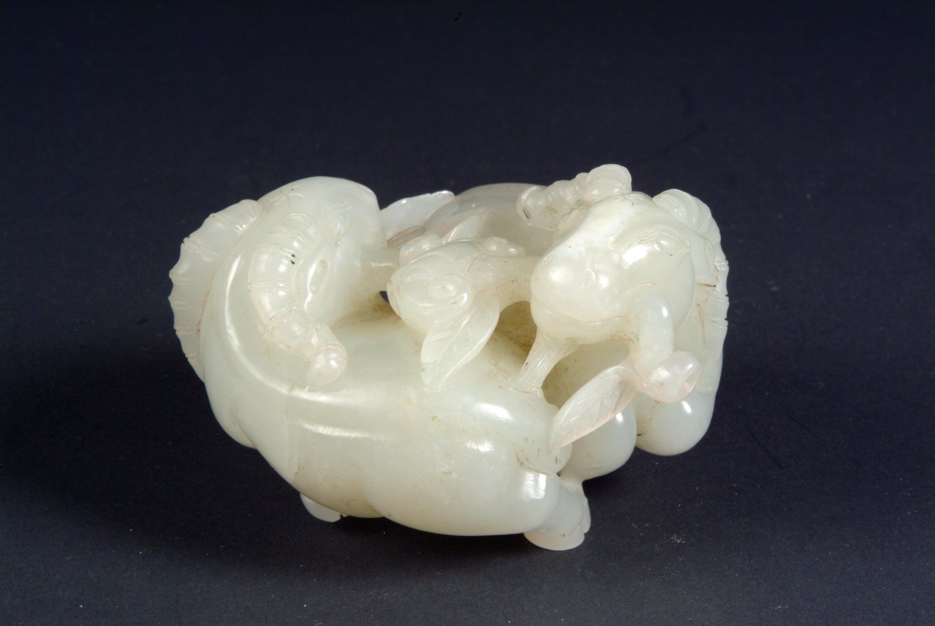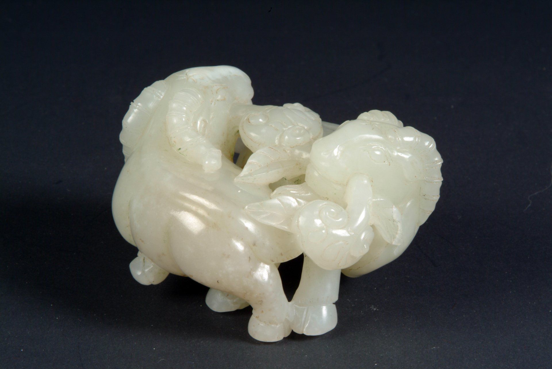 Изящно вырезанные из селадонового нефрита бараны эпохи династии Цин демонстрируют мастерство, напоминающее технику династии Сун, характерную для изящно сложенных под туловищем ног, открывающих замысловатые детали гениталий. Примечательно, что на этом изделии присутствуют полосы мутных включений, что ещё раз подтверждает его историческую подлинность. Общее мастерство и стиль исполнения свидетельствуют о его возрасте. Длина этой замечательной группы составляет около 4 3/4 дюйма (11,7 см).