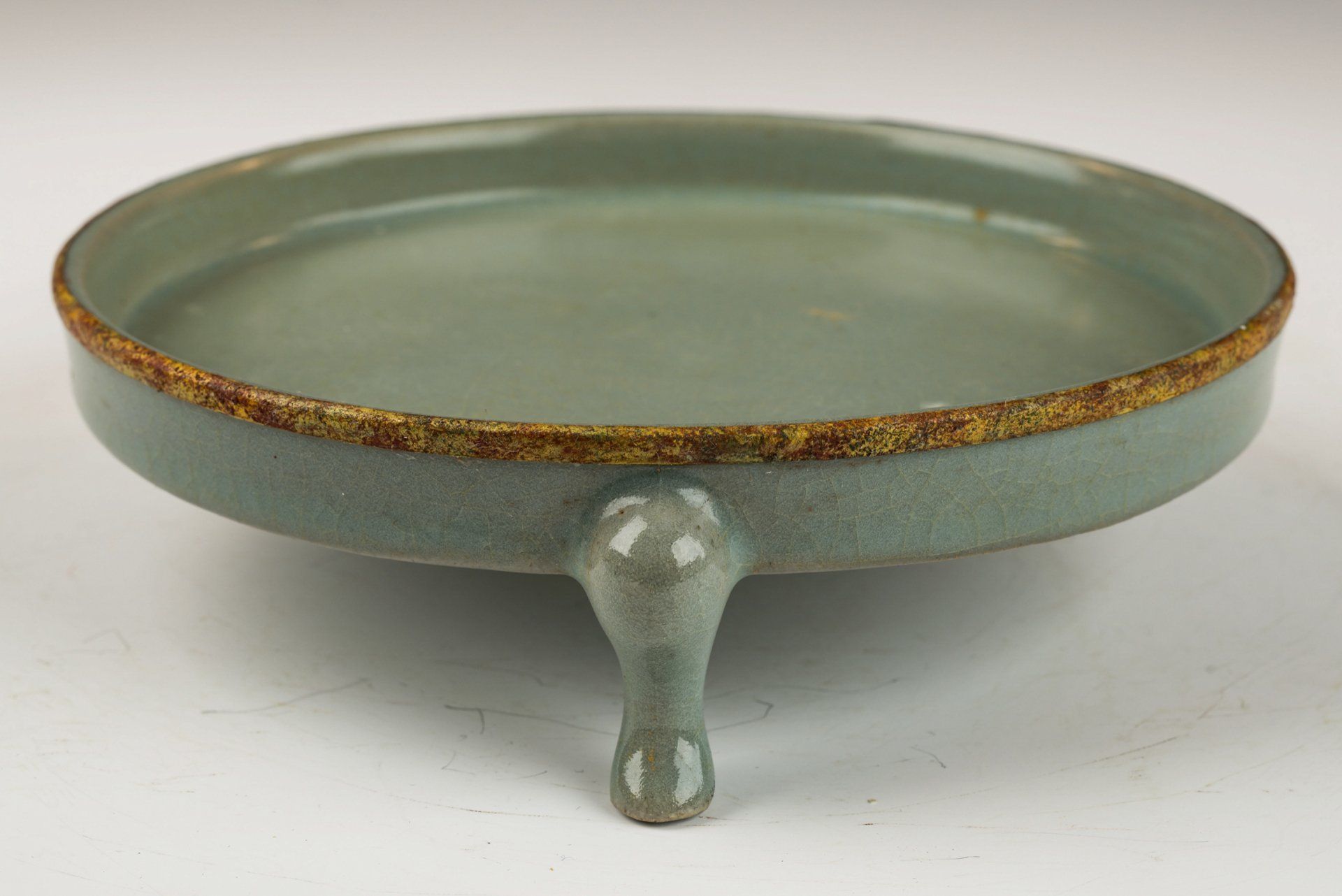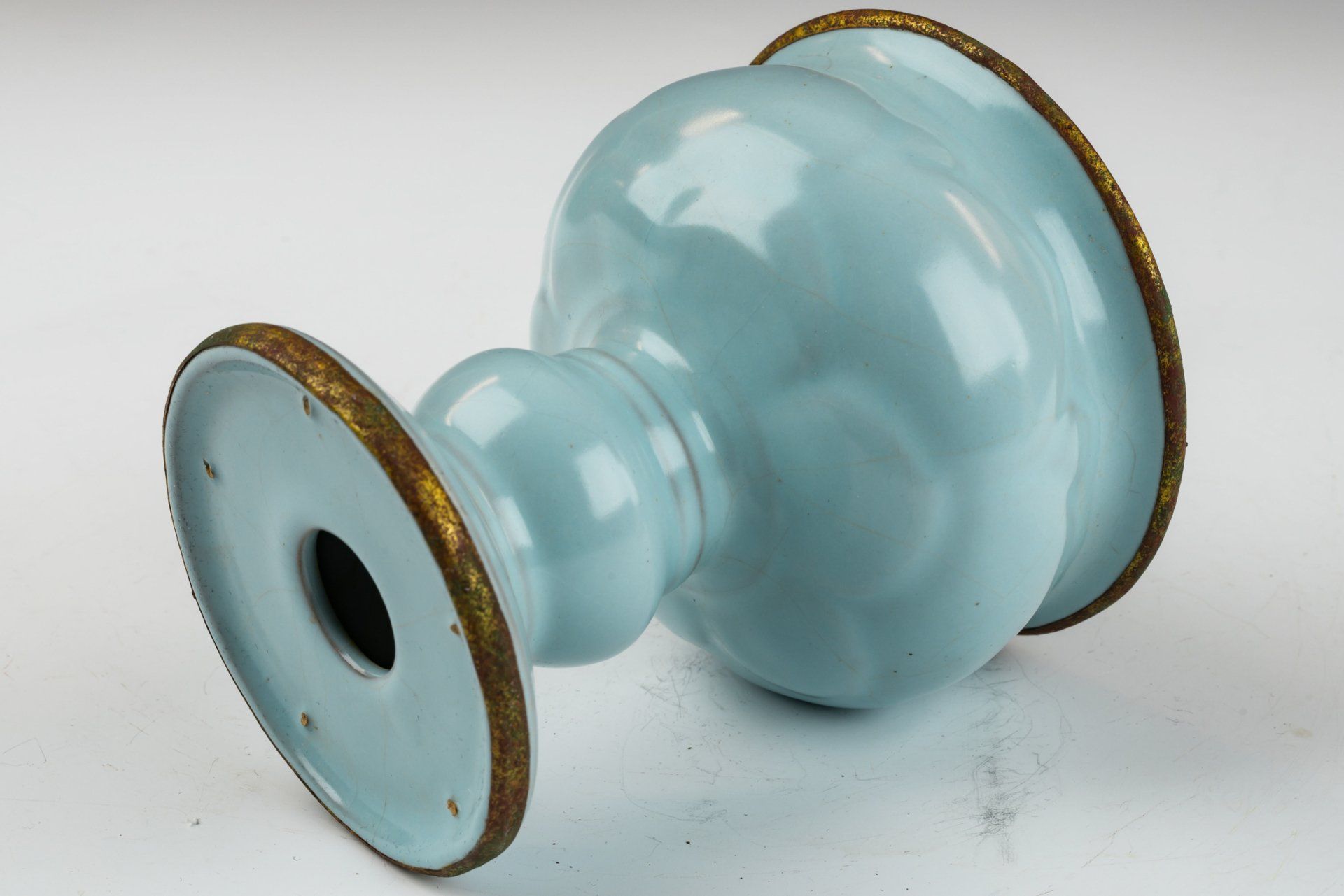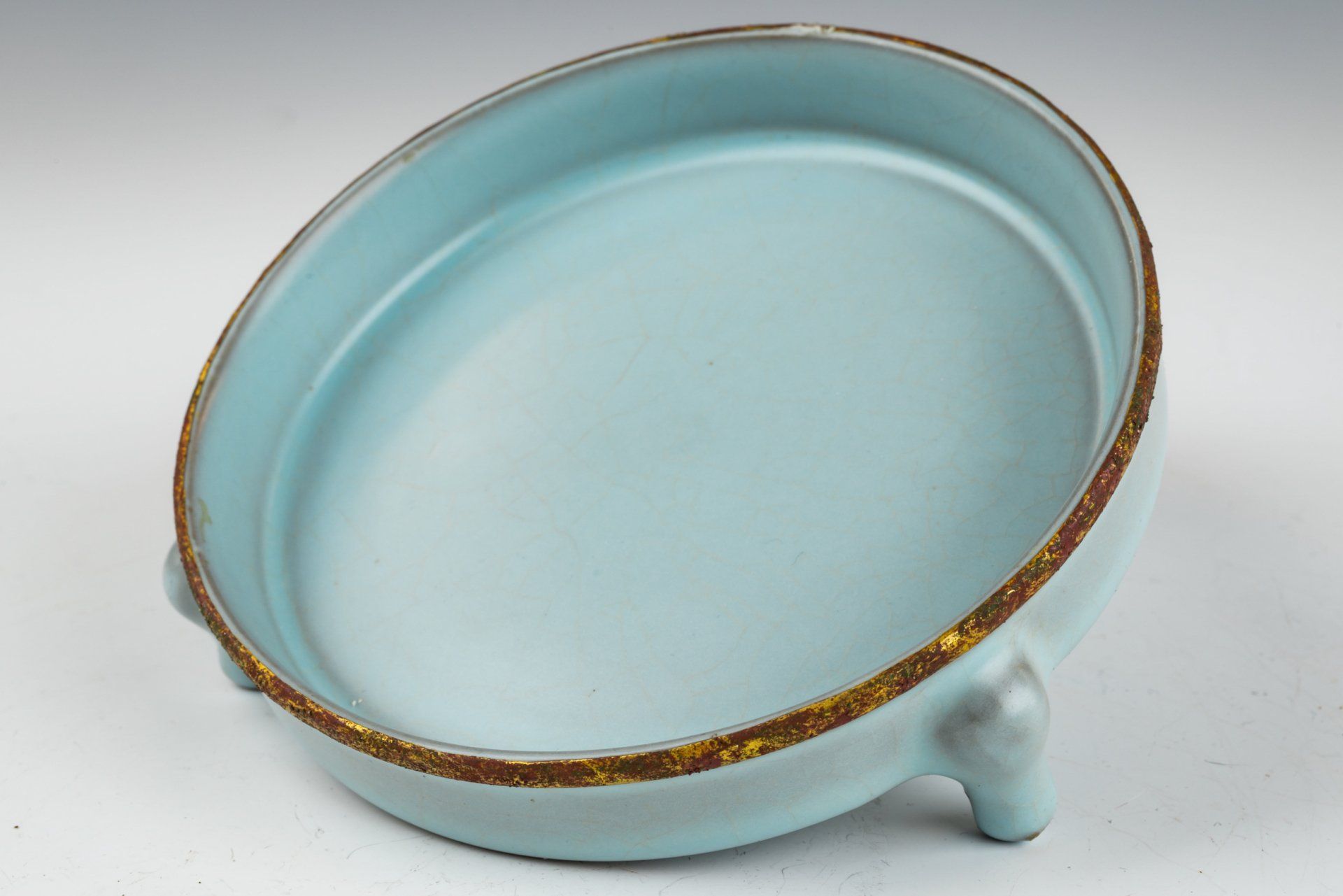 Эта изысканная небесно-голубая глазурь, напоминающая о кистеомоечной ёмкости Ru-ware, служит примером мастерства своей эпохи. Изделие отличается нежной, гладкой глазурью без какого-либо агата в составе. Изделие элегантно украшено медной полосой с огневым золочением, опоясывающей ободок. Примечательно, что вся руская посуда с огневым золочением относится к подношениям, преподнесённым императору и его двору. Позолоченная медная полоса подверглась незначительной очистке, обнажив характерные слои красноватого куприта и зелёного малахита, которые свидетельствуют о значительном возрасте изделия. Прилагаемые микроскопические фотографии подтверждают отсутствие агата в глазури, а видимая коррозия на позолоченной медной полосе служит дополнительным доказательством её подлинности — метод, признанный экспертами более надёжным, чем термолюминесцентный (ТЛ) анализ. Кистеомоечная ёмкость опирается на три ножки и имеет три крошечных отпечатка, напоминающих семена кунжута. Этот исключительный артефакт диаметром около 5 ½ дюймов происходит из сохранившегося тайника императорской посуды династии Н. Сун, связанной с императором Хуэйцзуном. ppjrs