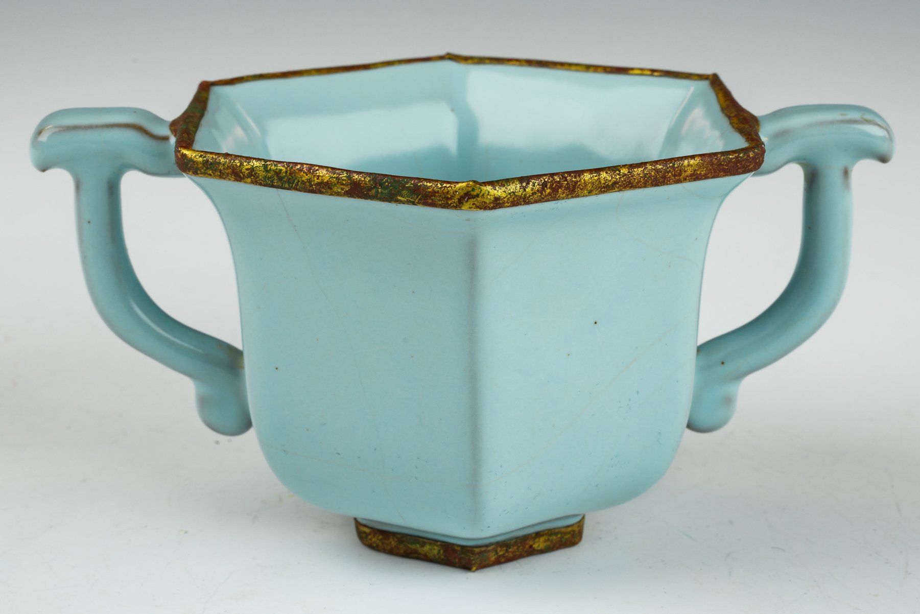 Эта исключительно тонкая небесно-голубая глазурованная шестигранная чаша – образец мастерства ру-вара. Изделие отличается мягкой, гладкой глазурью, в составе которой нет агата. Край и дно чаши украшены позолоченной огнем медной полосой, что указывает на её статус подношения императору и его двору. Позолоченные полосы подверглись минимальной очистке, обнажив слои красноватого куприта и зелёного малахита, свидетельствующие о значительном возрасте чаши. Прилагаемые микроскопические фотографии подтверждают полное отсутствие агата в глазури; более того, коррозия на позолоченной медной полосе отчётливо заметна, что является более надёжным методом определения подлинности, чем термолюминесцентный (ТЛ) тест – критерий, широко принятый специалистами в этой области. Чаша имеет две ручки и пятиминутные следы от шипов, размером с семена кунжута. Её высота составляет около 6,5 см. Этот замечательный экспонат происходит из сохранившейся коллекции императорской посуды династии Северная Сун императора Хуэйцзуна.