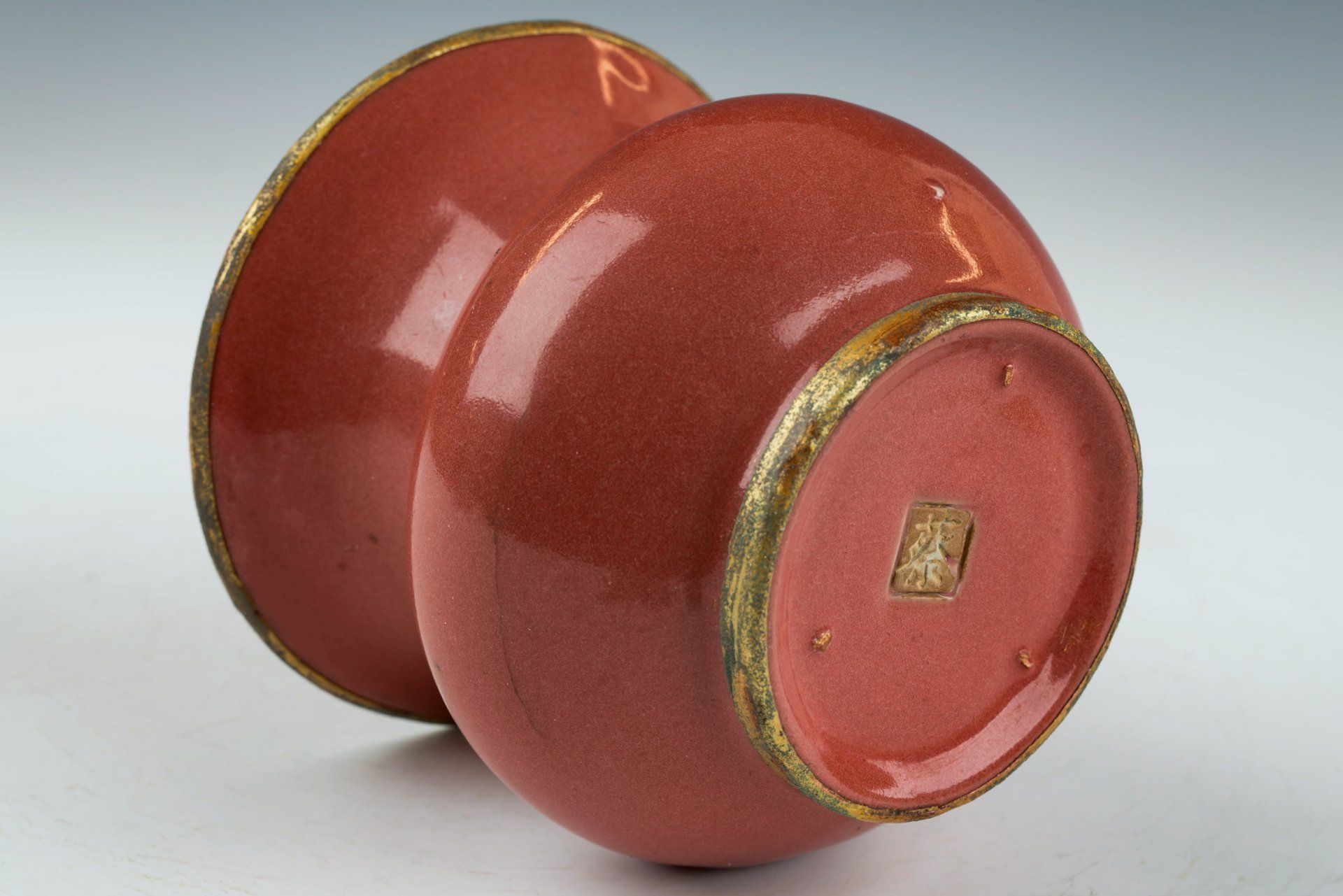 Эта исключительно искусно изготовленная кистеочистка, отличающаяся искусно выполненной рутовой керамикой и яркой красной глазурью, относится к эпохе династии Северная Сун. Изготовленная в память о императоре и его дворе, она украшена позолоченным медным ободом по ободу, демонстрирующим слои красноватого куприта и зелёного гроздевидного малахита. Микроскопический анализ подтверждает отсутствие агата в глазури, в то время как позолоченная медная полоса демонстрирует явные следы коррозии куприта и малахита, что ещё раз подтверждает её значительный возраст и подлинность. Этот метод проверки считается более надёжным, чем термолюминесцентный (ТЛ) тест, и используется экспертами для установления подлинности артефактов, поскольку этот рисунок коррозии невозможно сымитировать. Кистеочистка украшена завораживающей красной глазурью, которая при рассмотрении через лупу обнаруживает замысловатые, тонкие трещинки, а её поверхность сохраняет удивительно гладкую текстуру. Кроме того, на основании имеется резной знак, а на нижней стороне — три крошечных шипа, размером с семена кунжута. Этот предмет имеет диаметр около 14 см и входит в сохранившуюся коллекцию изделий эпохи жу, приписываемых императору Хуэйцзуну из династии Северная Сун. ppjrs