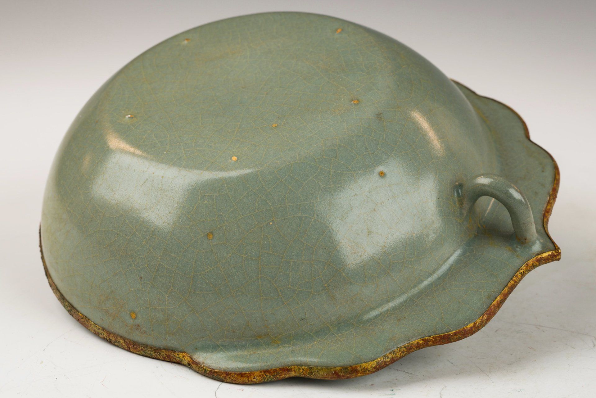 Эта изысканная ру-керамическая чаша с небесно-голубой глазурью, покрытая дольками, является примером исключительного мастерства и имеет историческую значимость. Чаша отличается элегантно гладкой и мягкой глазурью, в составе которой отсутствует агат. Её дизайн подчёркивает медный ободок с огневым золочением, опоясывающий край – отличительный признак ру-керамики, созданной в качестве подношения императору и его двору. Позолоченный ободок был слегка очищен, а наличие слоистой красноватой коррозии куприта и зелёного малахита дополнительно свидетельствует о значительном возрасте чаши. Прилагаемые микроскопические фотографии подтверждают отсутствие агата в глазури. Более того, видимая коррозия на позолоченном медном ободе служит надёжным индикатором подлинности, превосходя точность термолюминесцентного (ТЛ) теста – критерия, общепризнанного экспертами в этой области. Эта дольчатая чаша характеризуется восемью чёткими дольками и пятиминутными следами шипов, каждый из которых размером примерно с кунжутное семя. Общий диаметр этого замечательного изделия составляет около 4 3/4 дюйма. Эта чаша входит в состав сохранившегося клада из коллекции императорской посуды эпохи династии Северная Сун. ppjrs