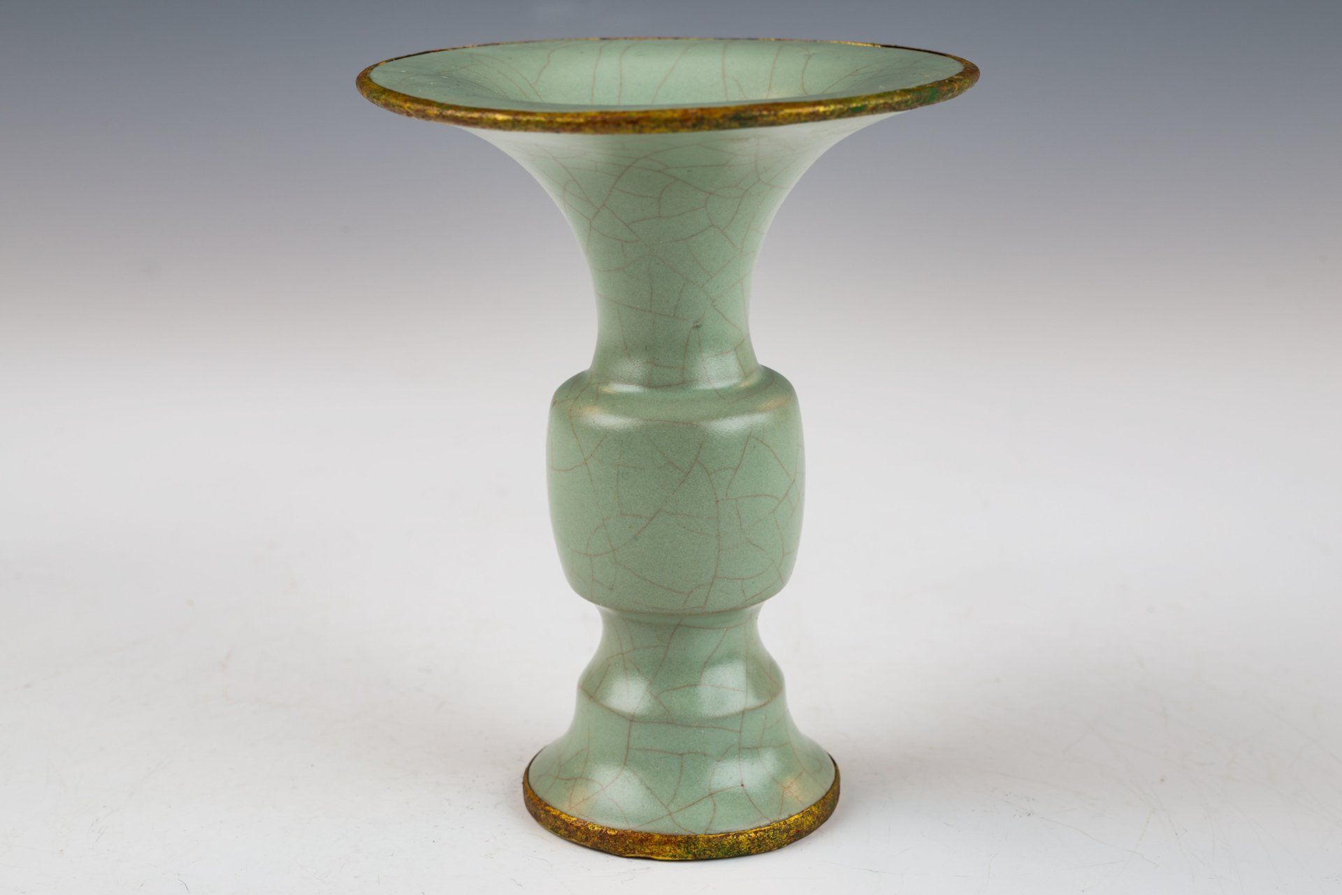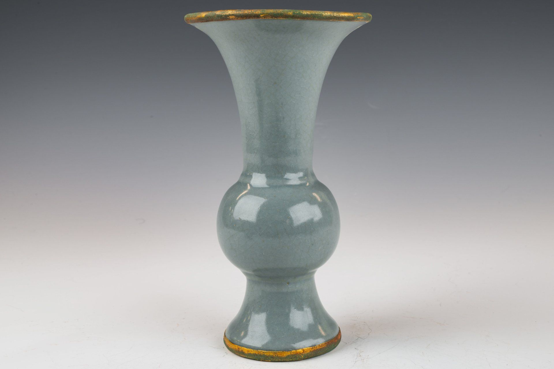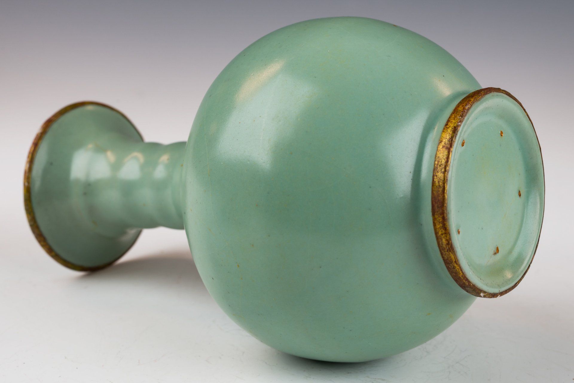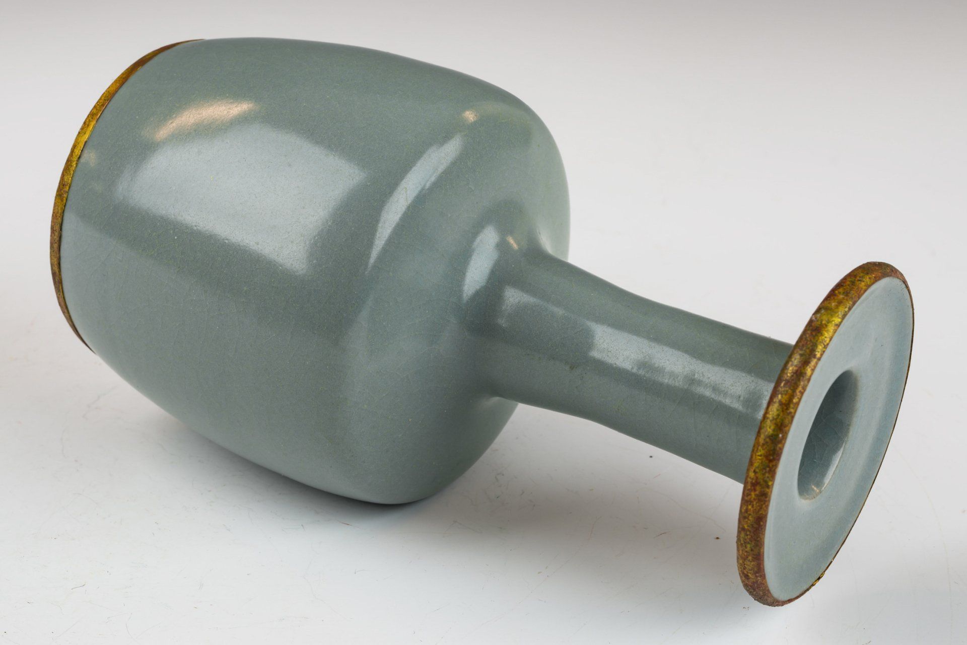 Эта исключительно изящная ваза из ру-фэра, отличающаяся изысканной светло-селадоновой глазурью, относится к эпохе династии Северная Сун и, как полагают, была изготовлена в качестве подношения императору и его двору. Ваза украшена медными полосами с огневым золочением, опоясывающими как край, так и дно, на которых видны незначительные следы красноватого куприта и зеленоватого малахита, образовавшиеся со временем. Микрофотография подтверждает отсутствие агата в глазурной матрице, в то время как позолоченные медные полосы демонстрируют заметные следы коррозии куприта и малахита, что свидетельствует о её значительной древности. Такое доказательство широко считается более надёжным, чем термолюминесцентный анализ, и используется экспертами в этой области для подтверждения подлинности артефактов, поскольку его сложно воспроизвести. Ваза покрыта нежной светло-селадоновой глазурью с тонкими трещинками, а поверхность сохраняет заметно гладкую текстуру. Кроме того, на основании вазы видны пятиминутные следы от шипов, размером примерно с кунжутное семя. Общая высота этого замечательного изделия составляет около 7 дюймов. Эта ваза — важная реликвия из сохранившейся коллекции посуды эпохи жу, связанной с императором Хуэйцзуном. ppjrs