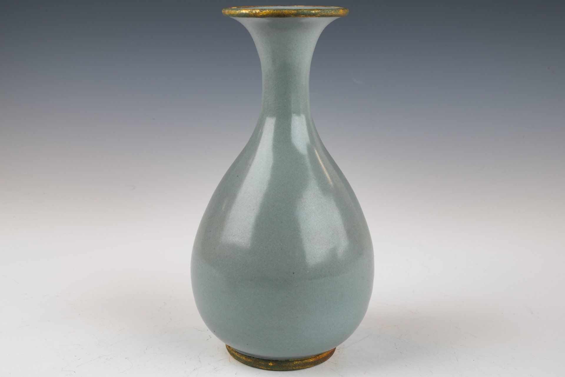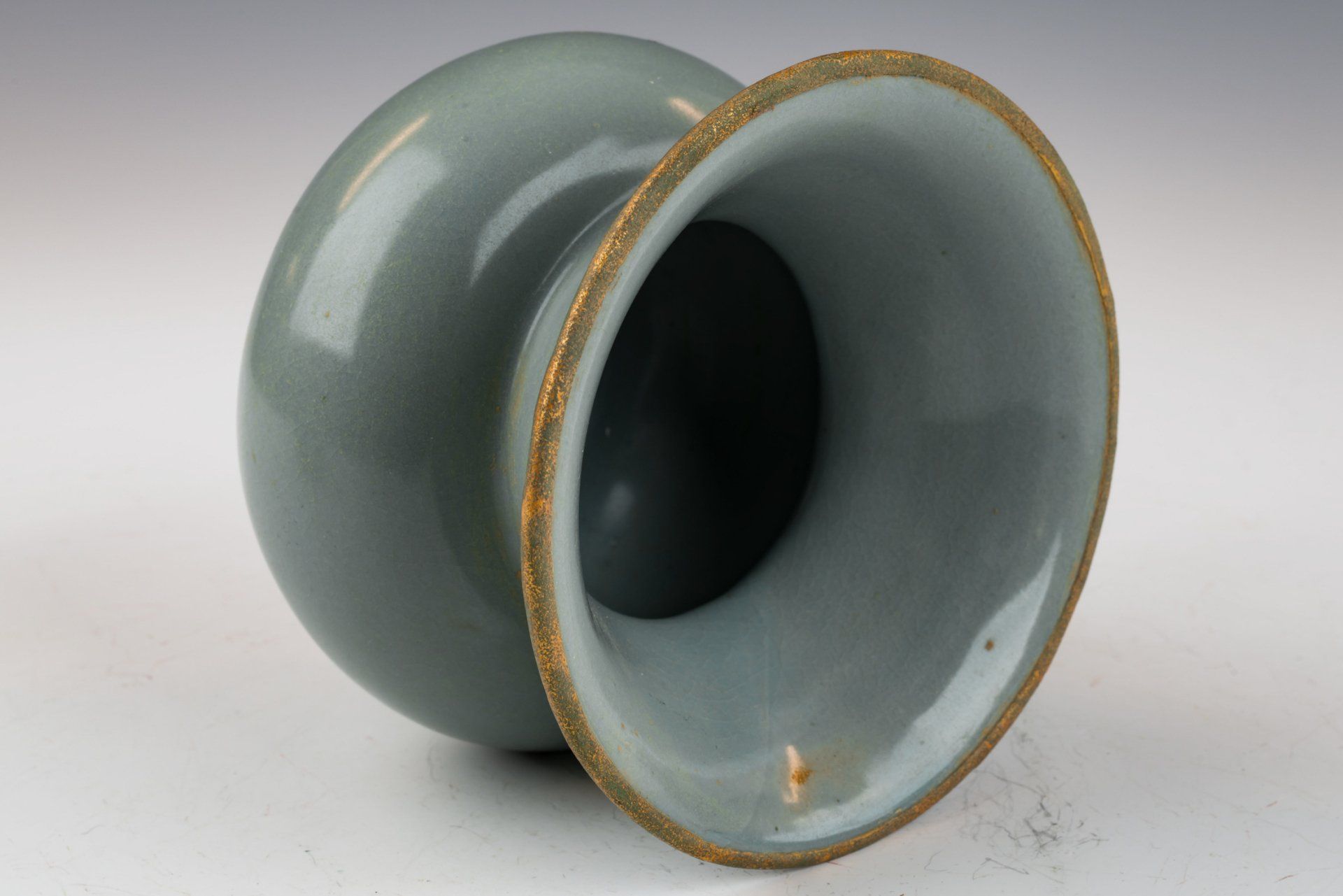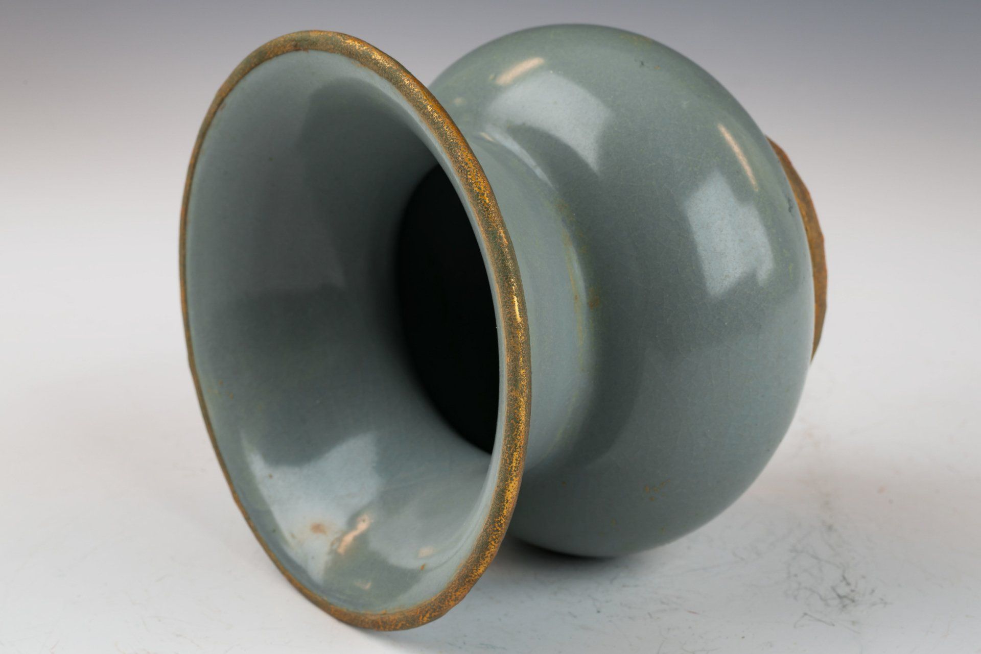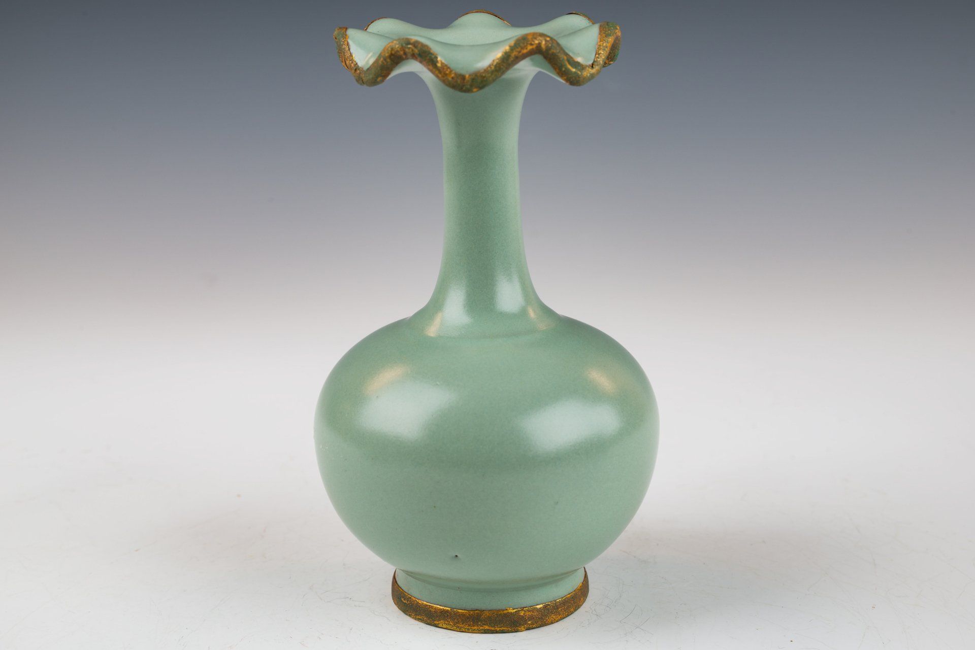 Эта исключительно изящная ваза из ру-фэра, отличающаяся изысканной светло-селадоновой глазурью, относится к эпохе династии Северная Сун и, как полагают, была изготовлена в качестве подношения императору и его двору. Ваза украшена медными полосами с огневым золочением, опоясывающими как край, так и дно, на которых видны незначительные следы красноватого куприта и зеленоватого малахита, образовавшиеся со временем. Микрофотография подтверждает отсутствие агата в глазурной матрице, в то время как позолоченные медные полосы демонстрируют заметные следы коррозии куприта и малахита, что свидетельствует о её значительной древности. Такое доказательство широко считается более надёжным, чем термолюминесцентный анализ, и используется экспертами в этой области для подтверждения подлинности артефактов, поскольку его сложно воспроизвести. Ваза покрыта нежной светло-селадоновой глазурью с тонкими трещинками, а поверхность сохраняет заметно гладкую текстуру. Кроме того, на основании вазы видны пятиминутные следы от шипов, размером примерно с кунжутное семя. Общая высота этого замечательного изделия составляет около 7 дюймов. Эта ваза — важная реликвия из сохранившейся коллекции посуды эпохи жу, связанной с императором Хуэйцзуном. ppjrs