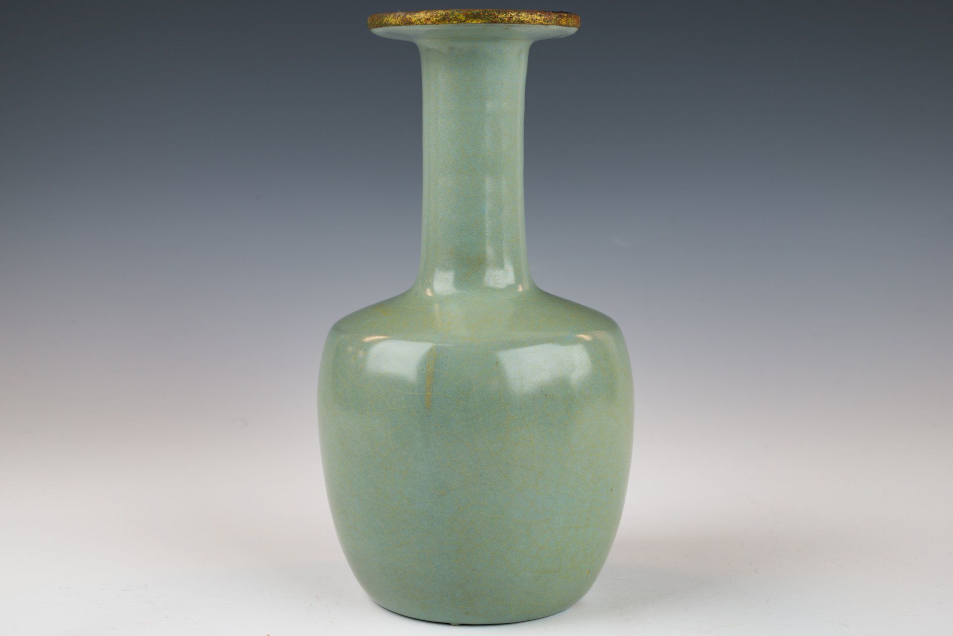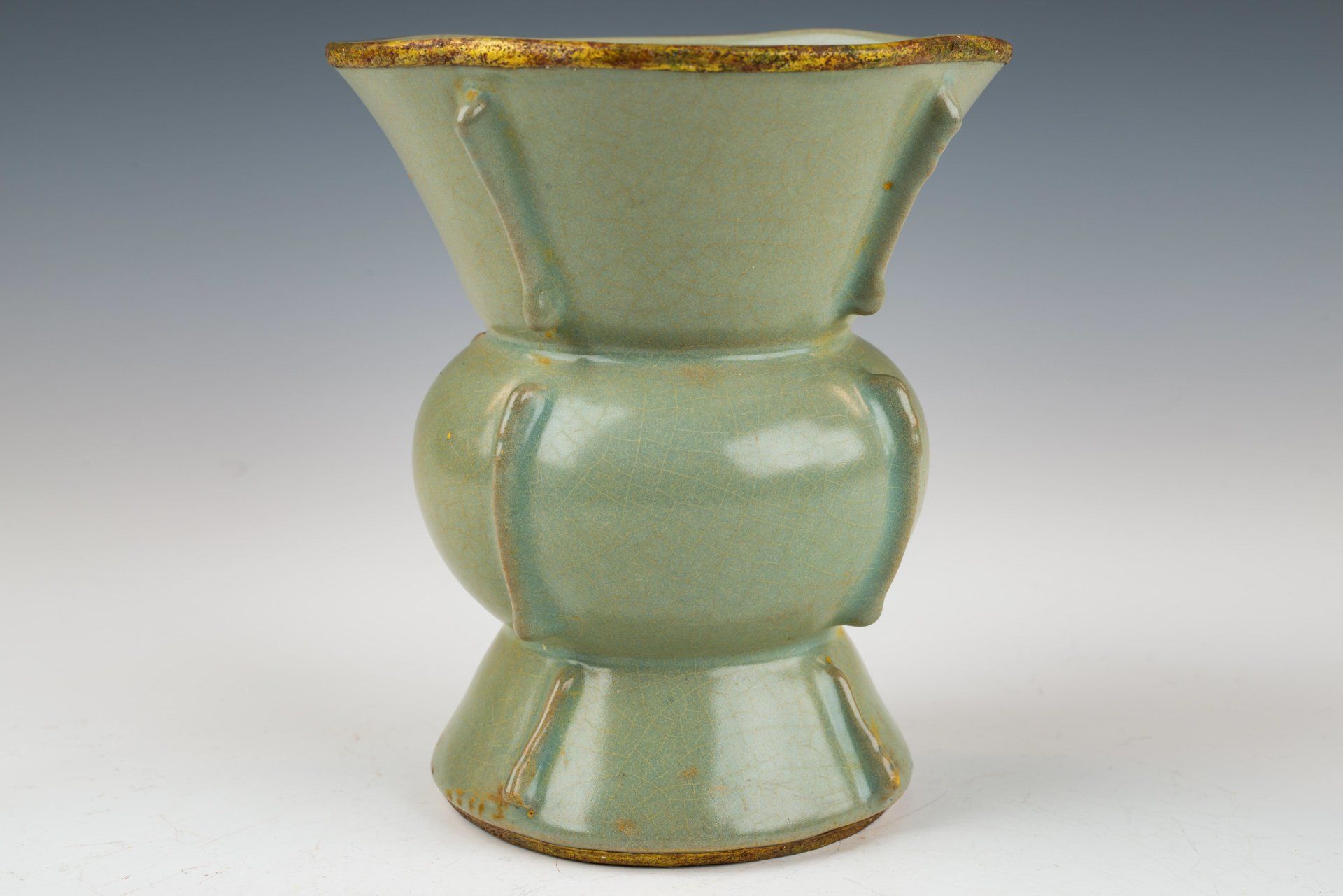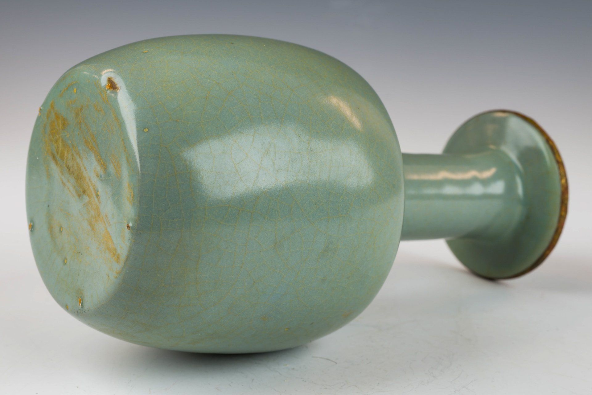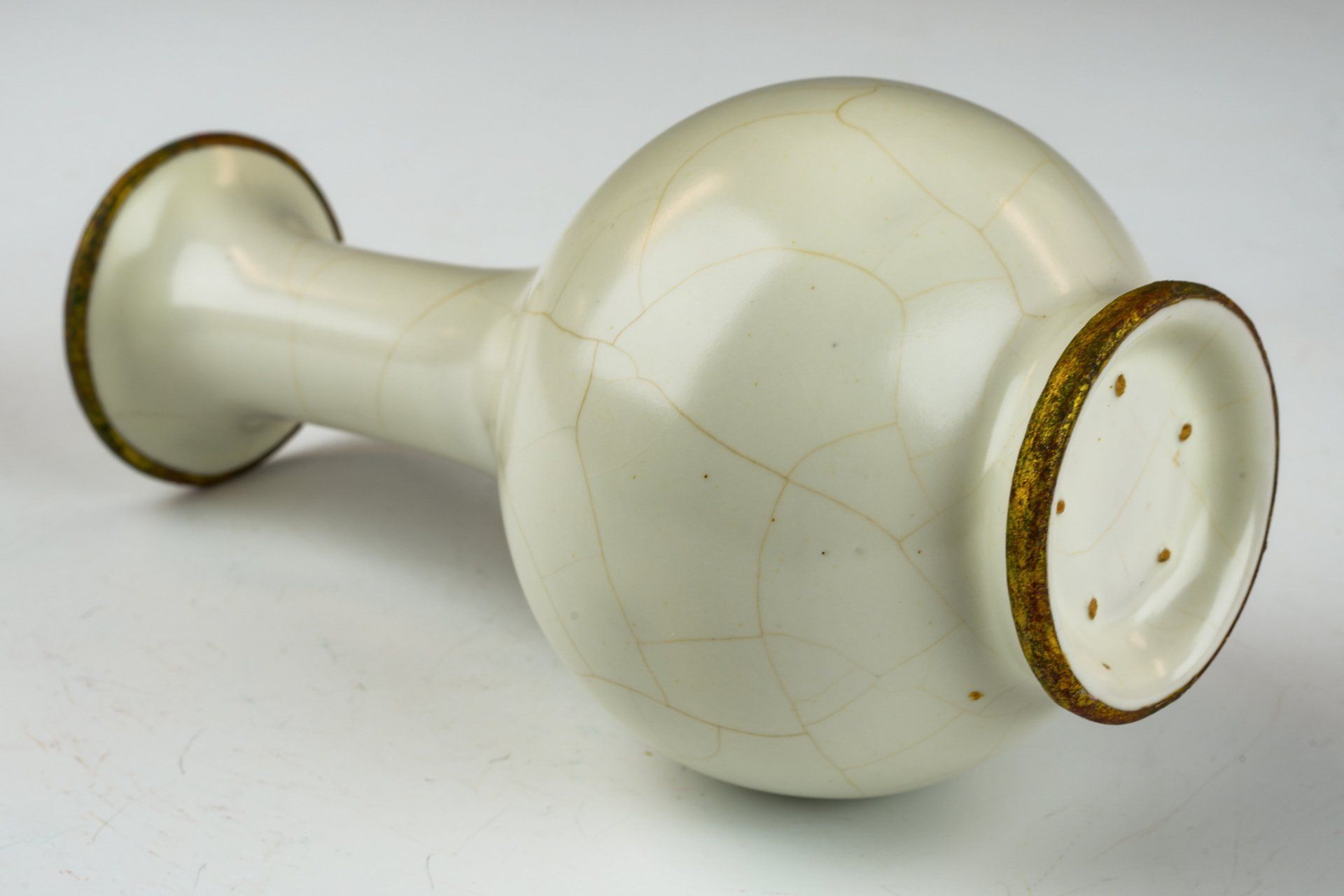 Эта исключительно изящная ваза из ру-фэра, отличающаяся изысканной светло-селадоновой глазурью, относится к эпохе династии Северная Сун и, как полагают, была изготовлена в качестве подношения императору и его двору. Ваза украшена медными полосами с огневым золочением, опоясывающими как край, так и дно, на которых видны незначительные следы красноватого куприта и зеленоватого малахита, образовавшиеся со временем. Микрофотография подтверждает отсутствие агата в глазурной матрице, в то время как позолоченные медные полосы демонстрируют заметные следы коррозии куприта и малахита, что свидетельствует о её значительной древности. Такое доказательство широко считается более надёжным, чем термолюминесцентный анализ, и используется экспертами в этой области для подтверждения подлинности артефактов, поскольку его сложно воспроизвести. Ваза покрыта нежной светло-селадоновой глазурью с тонкими трещинками, а поверхность сохраняет заметно гладкую текстуру. Кроме того, на основании вазы видны пятиминутные следы от шипов, размером примерно с кунжутное семя. Общая высота этого замечательного изделия составляет около 7 дюймов. Эта ваза — важная реликвия из сохранившейся коллекции посуды эпохи жу, связанной с императором Хуэйцзуном. ppjrs