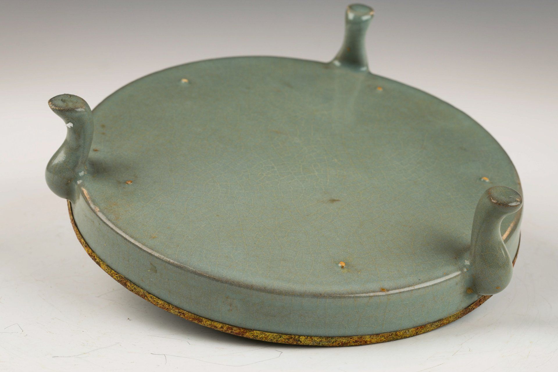 Эта изысканно выполненная ваза Ru ware эпохи династии Сун с глазурью цвета светлого селадона, украшенная характерной ручкой в виде тигра, является замечательной вазой-подношением, изначально предназначавшейся для императора и его двора. Ваза украшена позолоченными медными полосами по краю и основанию, демонстрирующими заметную коррозию, характеризующуюся красноватым купритом и зеленоватым гроздевидным малахитом. Микроскопический анализ подтверждает отсутствие агата в глазури, в то время как позолоченная медная полоса выявляет значительную коррозию куприта и малахита, что дополнительно подтверждает значительный возраст изделия. Этот метод аутентификации превосходит надежность термолюминесцентного (TL) тестирования и является стандартной практикой, используемой экспертами в этой области для проверки подлинности артефактов, поскольку такие особенности невозможно имитировать. Ваза отличается своей глазурью цвета светлого селадона, которая имеет изысканный кракелюр и гладкую текстуру, лишенную какого-либо агата в глазурной смеси. На нижней стороне вазы видны пятиминутные следы от шипов, каждый размером примерно с кунжутное семя. Этот исключительный предмет высотой около 6 ¾ дюймов (16,5 см) принадлежит к сохранившейся коллекции посуды императора Хуэйцзуна эпохи Северная Сун. ppjrs