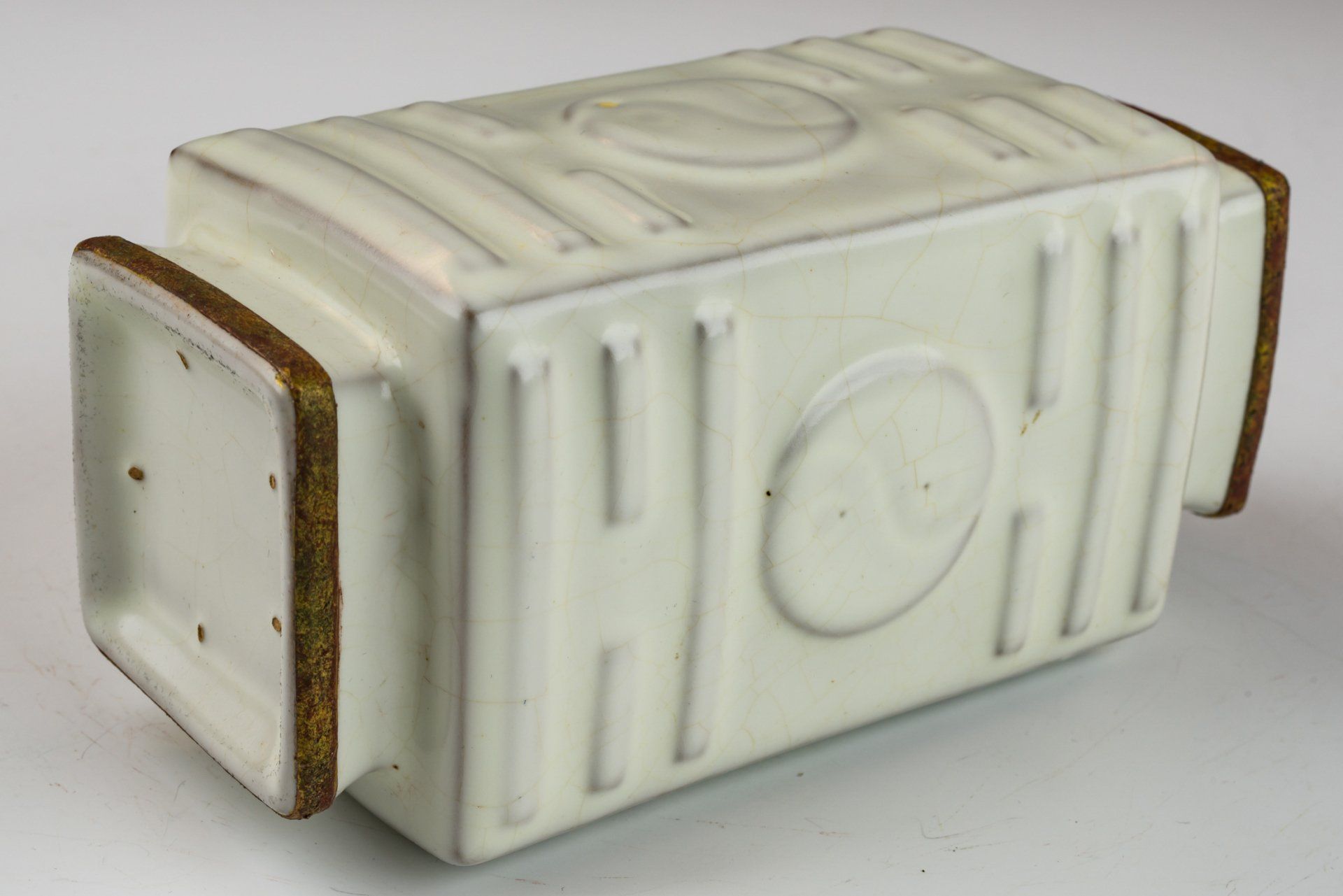 Эта изысканная ваза-подношение является примером мастерства ру-вара Fine Moonlight White Glaze Ru-ware, характеризующегося элегантной, мягкой и гладкой поверхностью без добавления агата в глазурь. Ваза украшена медными полосами с огневым золочением, украшающими как обод, так и основание, что указывает на её статус подношения, преподнесённого императору и его двору. Примечательно, что золотые полосы имеют следы минимальной очистки, обнажая слоистую коррозию красноватого куприта и зелёного малахита, что свидетельствует о значительном возрасте вазы. Сопутствующий микроскопический анализ подтверждает отсутствие агата в глазури, а наблюдаемая коррозия на позолоченной медной полосе убеждает коллекционеров в её подлинности. Этот метод проверки считается более надёжным, чем термолюминесцентный (ТЛ) тест, и широко применяется экспертами в этой области для определения происхождения артефактов, что снижает риск подделки. Ваза украшена пятью миниатюрными шипами, напоминающими по форме и размеру семена кунжута. Этот изысканный предмет высотой около 14 см происходит из сохранившегося клада коллекции императорской посуды династии Северная Сун императора Хуэйцзуна. ppjrs