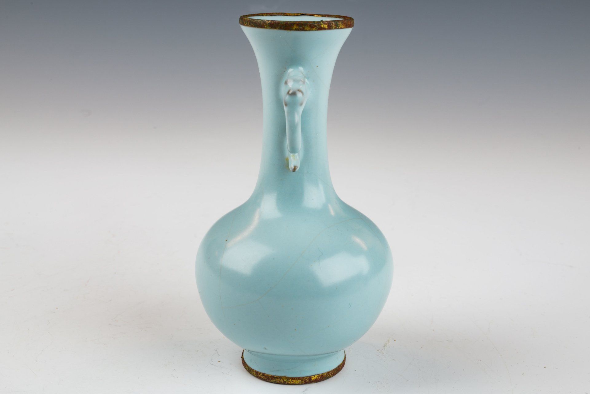 Эта исключительно изысканная небесно-голубая глазурованная ваза из ру-вара, ставшая подношением императору, украшена ручками в форме дракона и является примером высочайшего уровня мастерства и искусства. Ваза отличается изысканной, мягкой и гладкой глазурью, не содержащей агата в составе. Примечательно, что она украшена двумя медными полосами с огневым золочением, опоясывающими обод и основание, что указывает на её статус подношения императору и его двору. Медные полосы с огневым золочением подверглись минимальной очистке, обнажив слоистую красноватую коррозию куприта и зелёного малахита. Прилагаемые микроскопические фотографии убедительно свидетельствуют об отсутствии агата в глазури, в то же время отчётливо демонстрируя коррозию куприта и малахита на позолоченных полосах. Эти данные подтверждают значительный возраст вазы, превосходя уровень надёжности, полученный с помощью термолюминесцентного (ТЛ) тестирования. Это стандарт, используемый экспертами для определения подлинности артефактов, поскольку подобные характеристики изначально невоспроизводимы. Дальнейшее исследование выявило пятиминутные следы от шипов, каждый из которых по размеру сопоставим с семенами кунжута. Ваза имеет высоту около 14 см и является замечательным экспонатом из коллекции сохранившейся императорской посуды эпохи Северной Сун, принадлежавшей императору Хуэйцзуну.