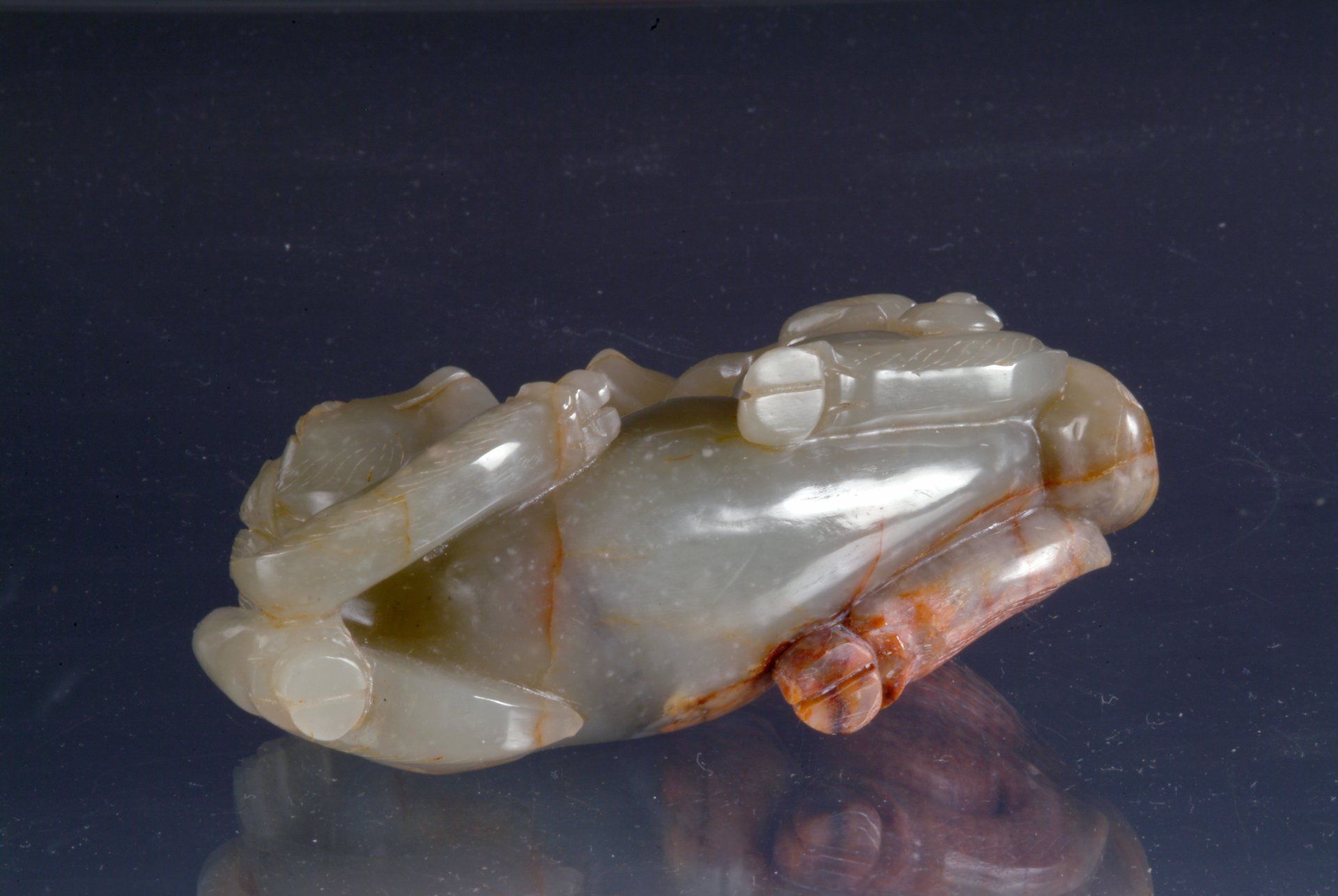 Эта искусно выполненная статуя из селадонового нефрита эпохи Шести династий, изображающая отдыхающего барана со всадником, отличается заметными красновато-коричневыми включениями. Изысканность резьбы подтверждает её возраст. Размеры статуи