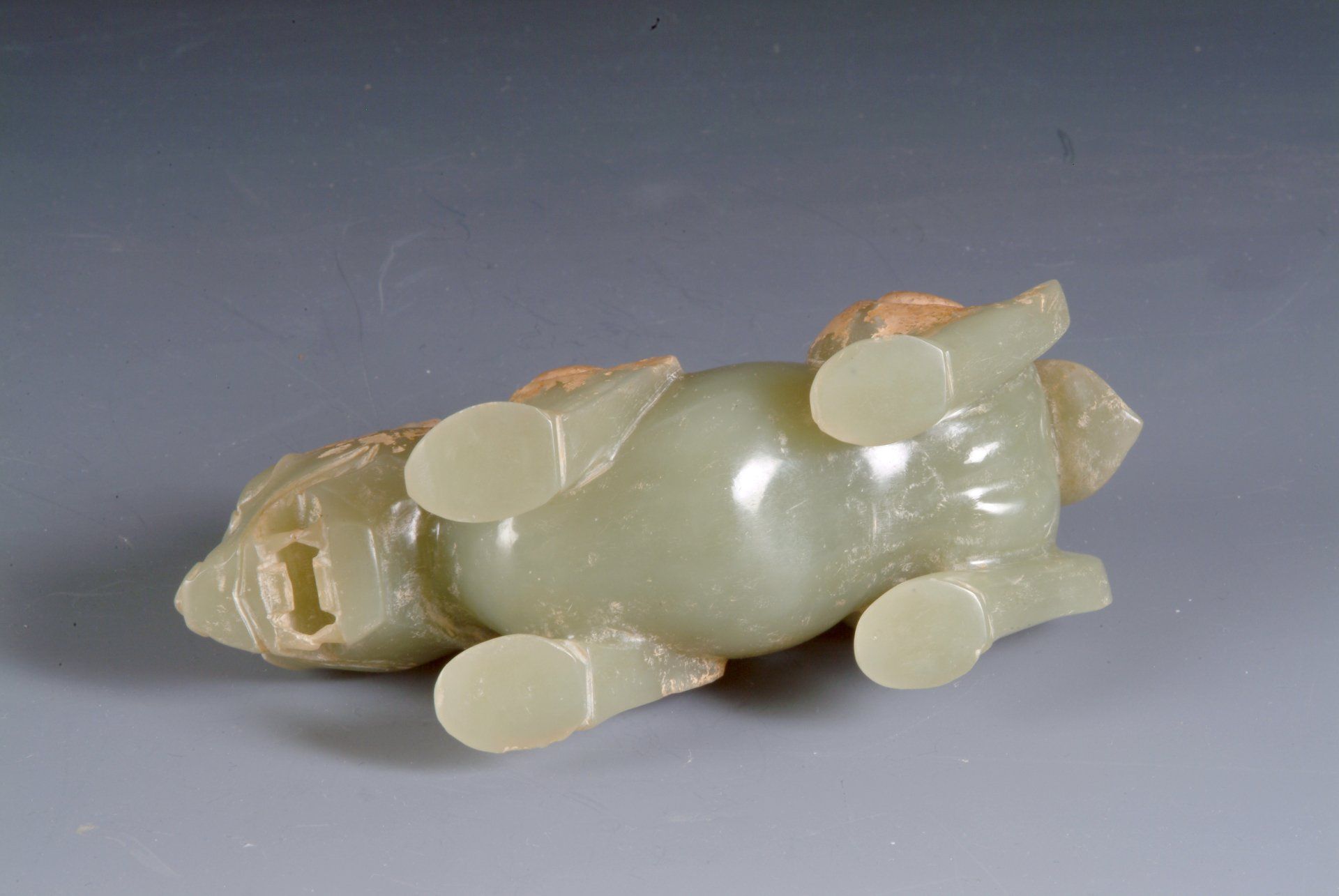 Эта искусно выполненная статуя мифического животного из селадонового нефрита, относящаяся к периоду Шести династий, демонстрирует характерные коричневатые отложения, подтверждающие её подлинность и возраст. Изысканная резьба дополнительно подтверждает её историческую значимость. Длина изделия составляет около 4,5 дюймов (11,7 см).