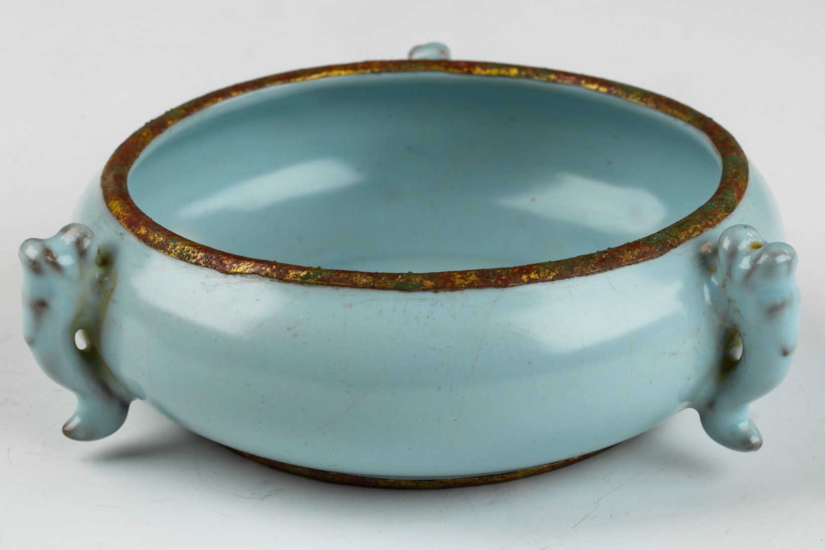 This exceptionally refined sky-blue glazed tribute Ru-ware brush washer features three elegantly designed handles. The glaze exhibits a remarkably soft and smooth texture, devoid of any agate in the glaze mix. Encircling both the rim and the base is a fire-gilded band crafted from copper. It is important to note that Ru-ware items adorned with fire-gilded bands were specifically produced as tributes for the Emperor and his court. The gilded copper bands have undergone slight cleaning, showcasing layered corrosion in the form of reddish cuprite and green malachite. Accompanying microscopic examinations substantiate the absence of agate in the glaze, while the gilded copper band displays discernible signs of cuprite and malachite corrosion. Such evidence is indicative of the piece’s significant age and serves as a more reliable measure than thermoluminescence (TL) tests, as recognized by experts in the field for determining the authenticity of artifacts—this characteristic is inimitable. The brush washer is adorned with three dragon handles and features five spur marks, each approximately the size of a sesame seed. With a diameter of approximately 5 3/8 inches, this remarkable piece hails from the surviving collection of Emperor Huizong's Northern Song Imperial Ru-ware. ppjrs