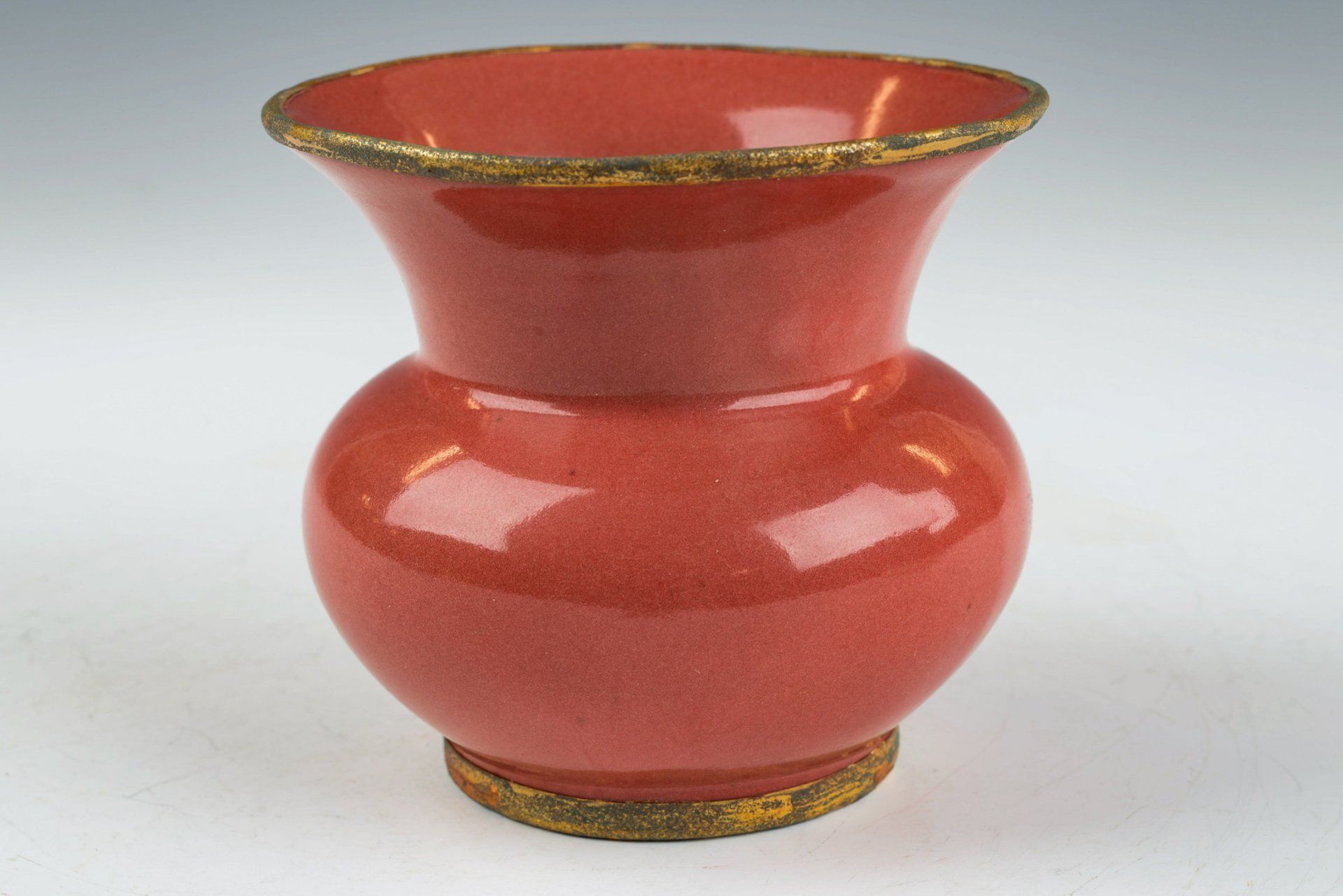 An exceptionally crafted and aesthetically striking red-glazed Ru-ware spittoon, dating back to the Northern Song Dynasty, exemplifies the artistry of this period. This vessel, created as a tribute for the Emperor and his court, features intricately crafted fire-gilded copper bands encircling both the rim and base. Notably, these bands exhibit layered corrosion of reddish cuprite and green botryoidal malachite, indicating significant antiquity. Microscopic inspections confirm the absence of agate within the glaze, reinforcing the authenticity of this exquisite piece. The held gilded copper band prominently displays corrosion patterns of cuprite and malachite, which serve as a more reliable indicator of age than thermoluminescence (TL) testing; such evidence is universally recognized by experts as a definitive measure of an artifact's authenticity, impervious to forgery. The vessel is adorned with a rich red glaze exhibiting finely detailed crackle patterns, observable under magnification, alongside a notably smooth texture. Its base is marked by three minute spur marks, comparable in size to sesame seeds, and is accompanied by a carved tribute mark. This remarkable artifact measures approximately 4 1/8 inches in diameter and is part of the surviving collection of imperial Ru Ware from the reign of Emperor Huizong. ppjrs
