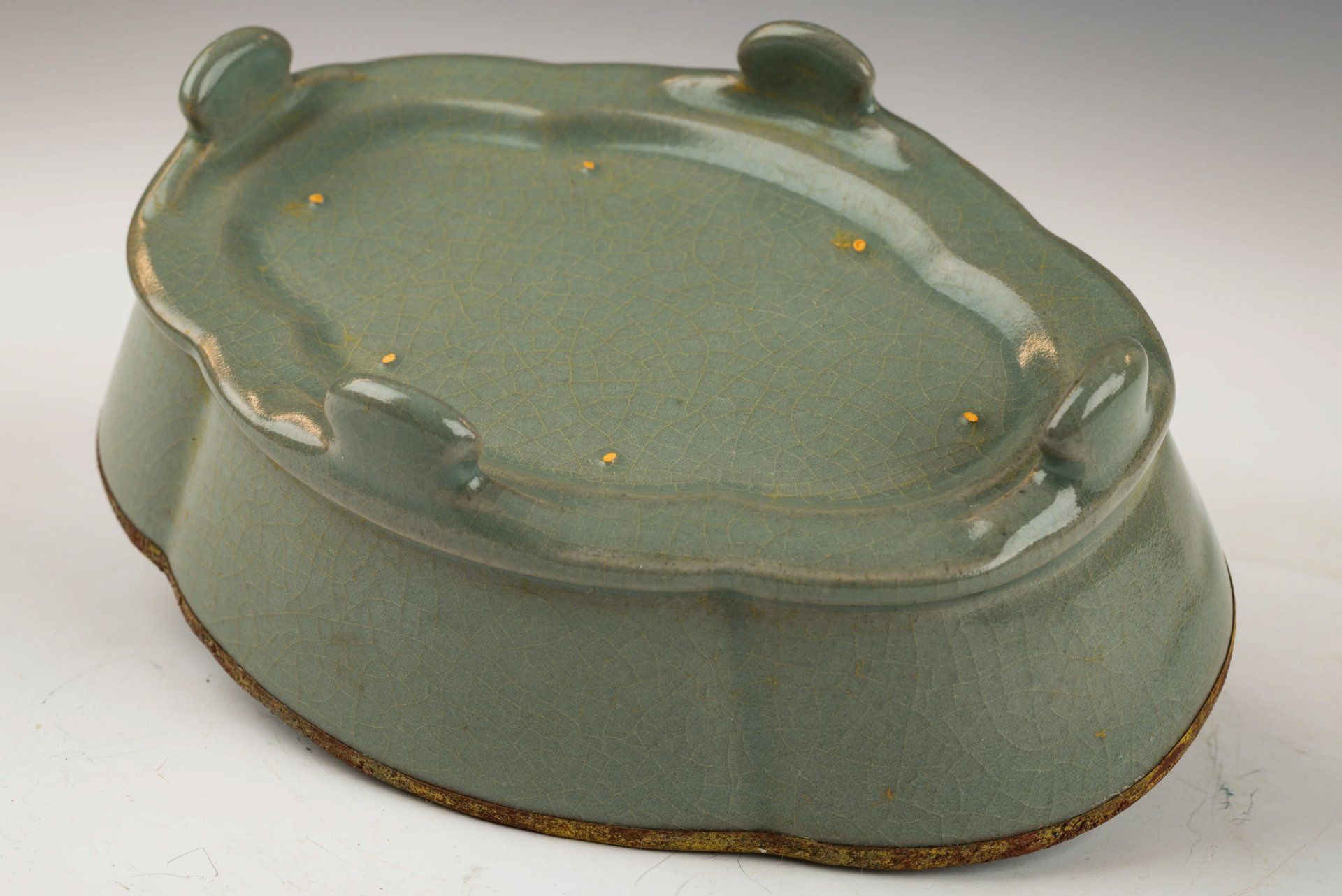 Presenting an exceptionally refined N. Song Dynasty Ru-ware olive green glaze lobed Narcissus bowl, meticulously crafted and historically significant. This exquisite brush washer was produced as an offering to the Emperor and his Court, featuring a fire-gilded copper band encircling the rim. Accompanying microscopic photographs confirm the absence of agate in the glaze, while the gilded copper band displays visible cuprite and malachite corrosion. Such analyses provide a more reliable assessment of age than a thermoluminescence (TL) test and are widely accepted by experts in the field as definitive proof of authenticity, making it resistant to forgery. The olive green glaze is characterized by a delicate crackle pattern and a smooth texture, further affirming its quality. The base of the bowl features six minuscule spur marks reminiscent of sesame seeds. The Narcissus bowl measures approximately 7 1/4 inches in length and is a remarkable remnant from the surviving collection of Emperor Huizong’s N. Song Imperial Ru ware. ppjrs