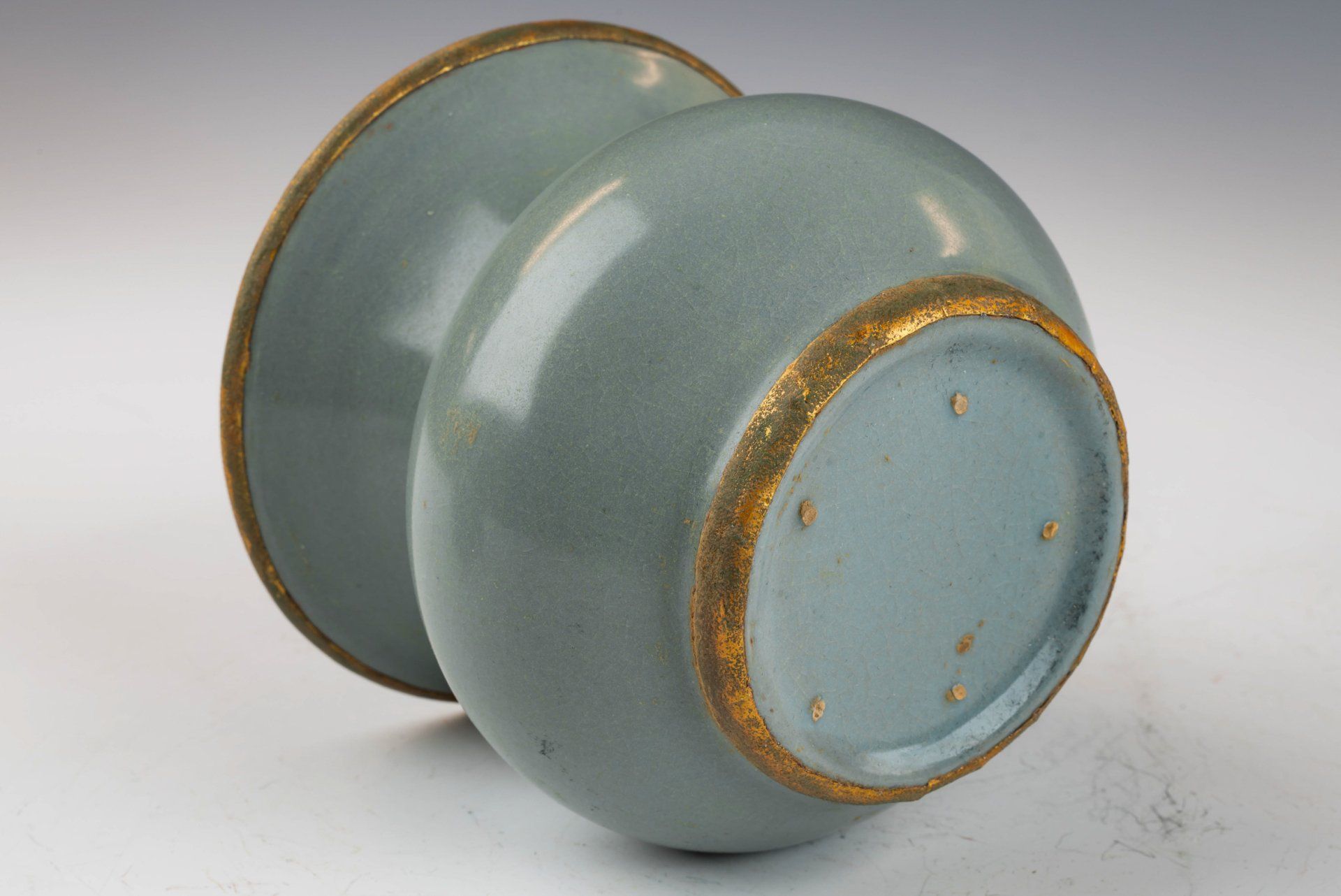 This exquisite sky-blue glazed Ru-ware vase, renowned for its elegant form, exemplifies the artistry of tribute porcelain. The vase features a remarkably soft and smooth glaze, devoid of any agate in the glaze mix. It is adorned with fire-gilded copper bands encircling the rim, an indication of its status as tribute ware presented to the Emperor and his court. The gilded bands reveal layered corrosion consisting of reddish cuprite and green botryoidal malachite, further emphasizing the vase's antiquity. Microscopic analysis has definitively verified the absence of agate within the glaze, while the corrosion on the gilded copper band—a clear manifestation of cuprite and malachite—serves as incontrovertible evidence of the vase's age. This method surpasses thermoluminescence testing in reliability, as it is widely utilized by experts to authenticate artifacts, ensuring the provenance of this piece cannot be fabricated. Additionally, the vase displays five-minute spur marks, akin to sesame seeds, further attesting to its craftsmanship. Standing approximately 7 1/8 inches tall, this remarkable artifact originates from the surviving collection of Emperor Huizong of the Northern Song Dynasty. ppjrs