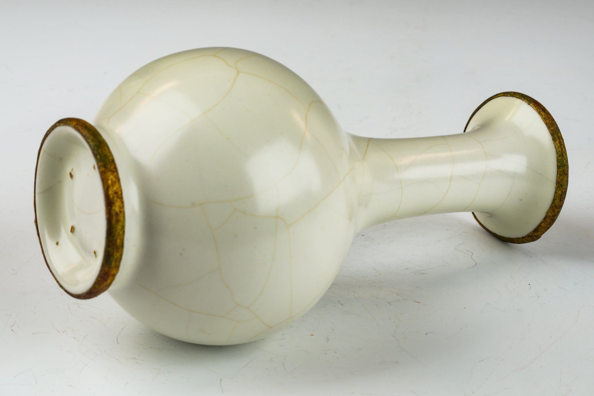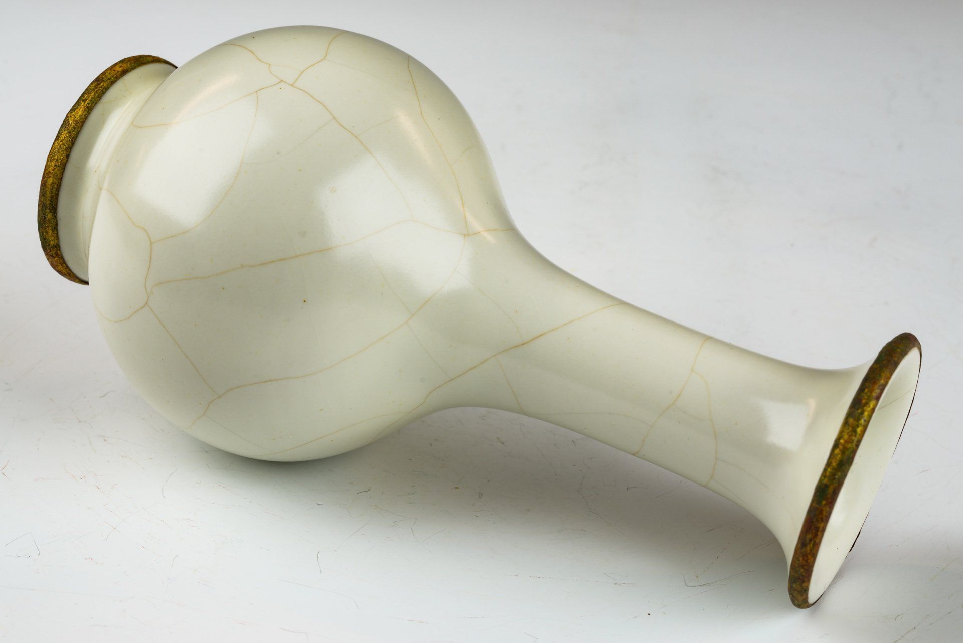 This exquisite tribute vase is a finely crafted example of Ru-ware, distinguished by its exceptionally delicate moonlight white glaze, free of any agate within the glaze composition. The vase features two fire-gilded copper bands encircling both the rim and the base, characteristic of tribute wares commissioned for the Emperor and his court. Notably, the fire-gilded bands exhibit some signs of cleaning and show layers of reddish cuprite and green malachite corrosion, indicating their considerable age. Supplemental microscopic photographs corroborate the absence of agate in the glaze, and the observable cuprite and malachite corrosion on the gilded copper bands serve as a testament to the vase’s authenticity. This method of validation is recognized by experts as being more reliable than thermoluminescence (TL) testing, thereby ensuring the vase's status as a genuine artifact that cannot be fabricated. Additionally, the vase is marked with five diminutive spur marks, resembling the shape and size of sesame seeds. The tribute vase stands approximately 6 ¾ inches tall and originates from the surviving collection of Emperor Huizong's Northern Song Imperial Ru-ware. ppjrs